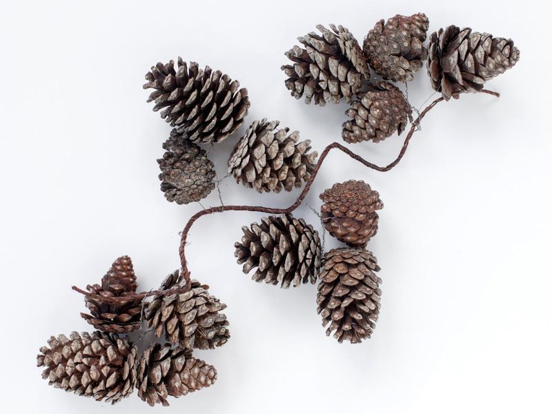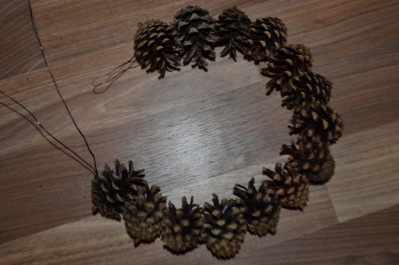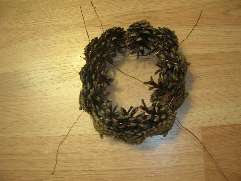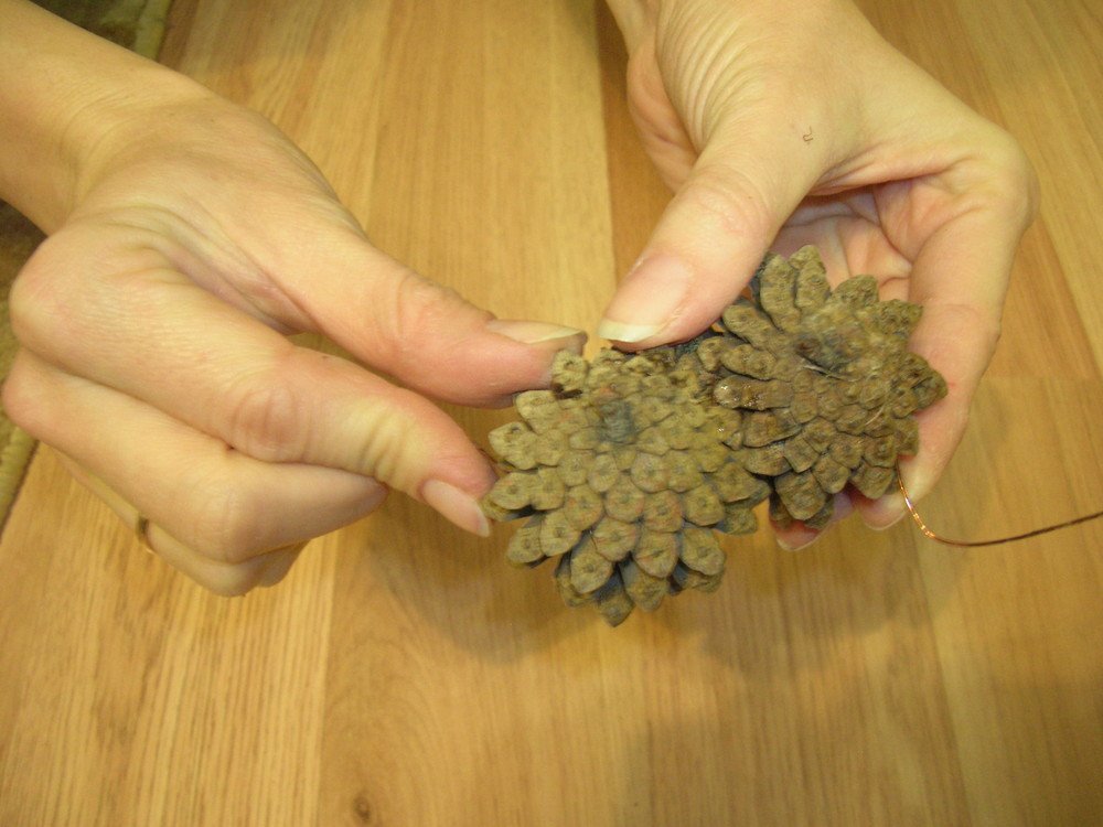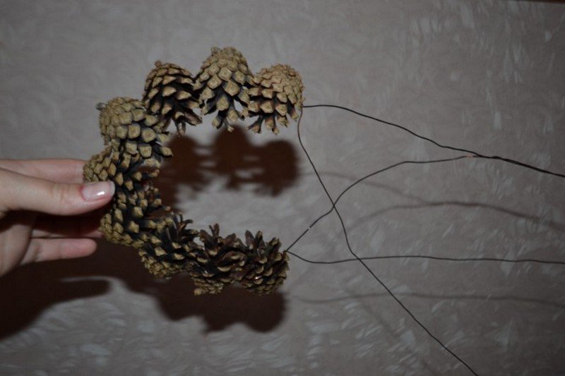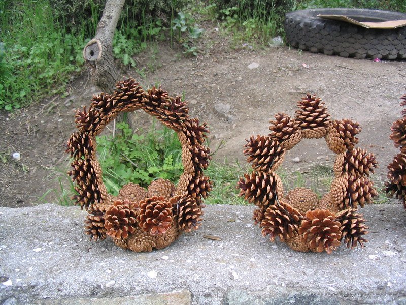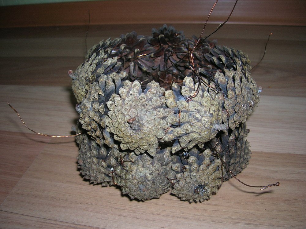 Las estructuras más grandes están hechas de casi doscientos conos, para mayor resistencia entre sí mediante alambre. Aquí, todos los elementos se colocan al revés, por lo que el diseño se ve más estético, ordenado y, debido al hecho de que no hay pegamento aquí, resulta completamente ecológico. Para unir un bulto a otro, está rodeado por un lazo de alambre y una "cadena" de varios objetos se cierra en un anillo.