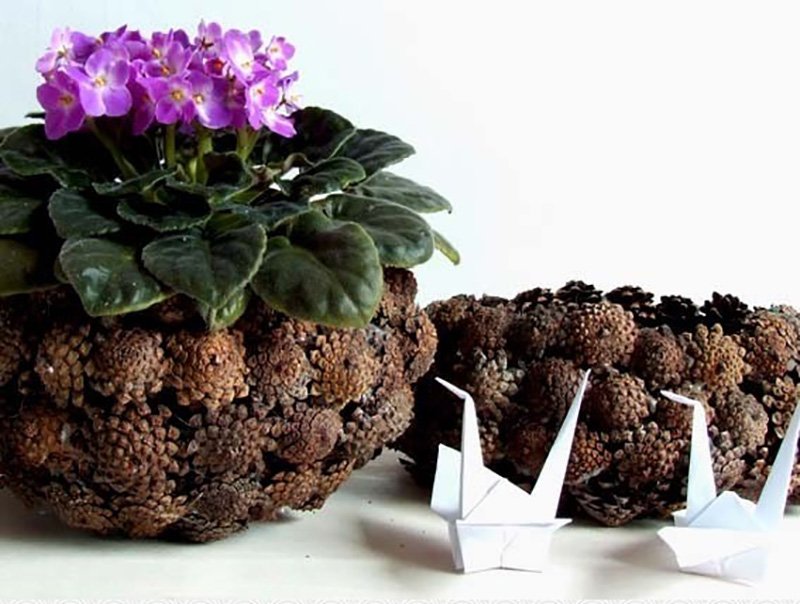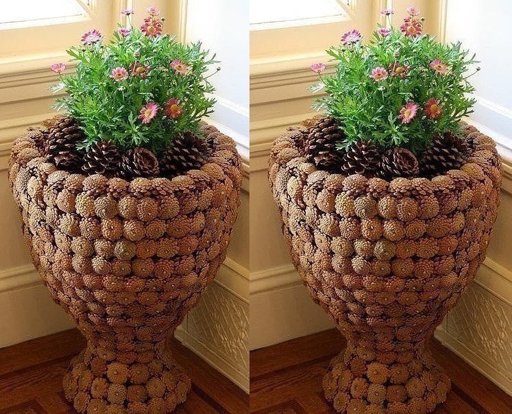 Una maceta de caché es un diseño decorativo, dentro del cual se coloca una maceta con plantas vivas, principalmente rizadas y ampelosas. Para comenzar, se selecciona una maceta de plástico o cerámica, que luego se colocará en la canasta. Los conos se unen o se pegan directamente a la maceta. El asa de la cesta se hace más alta que en una simple decorativa, para que nada impida que la flor crezca en altura. No es necesario hacer el fondo con materiales naturales, solo las paredes laterales. Los bordes de la estructura son de uno a dos cm más altos que la maceta.