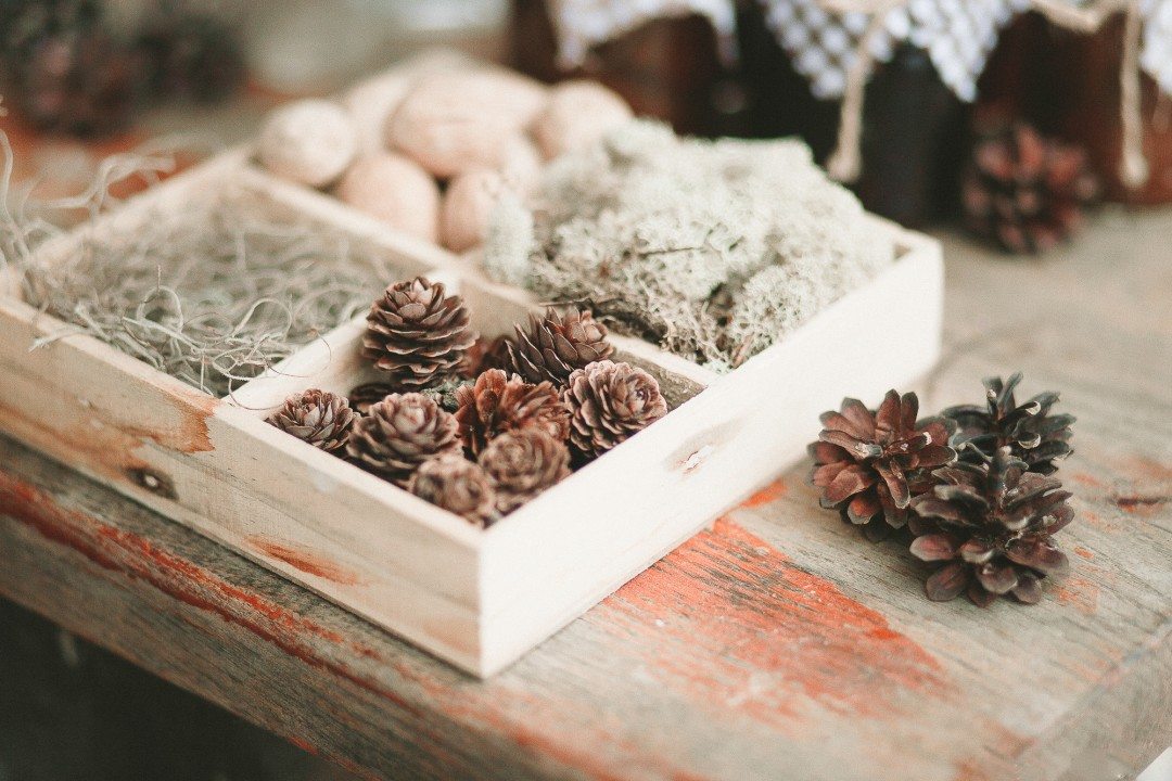 Para crear un objeto tan funcional, necesitará una pequeña caja hecha de madera contrachapada delgada, adhesivo termofusible, una grapadora de construcción y un mango de madera. La caja se coloca sobre una superficie plana, pegada de abajo hacia arriba, los detalles se colocan a su gusto, puede combinar elementos de cualquier forma, color y tamaño. La fila superior del "cono" debe oscurecer ligeramente los bordes de la caja, y su parte interna está teñida del color de los conos.Una manija delgada tejida con una varilla o tallada en madera se sujeta con una engrapadora, se pega con semillas de verduras, cereales y se espolvorea con chispas. Tal producto es adecuado para almacenar artículos pequeños de costura, varias bagatelas de cocina y artículos de mercería.