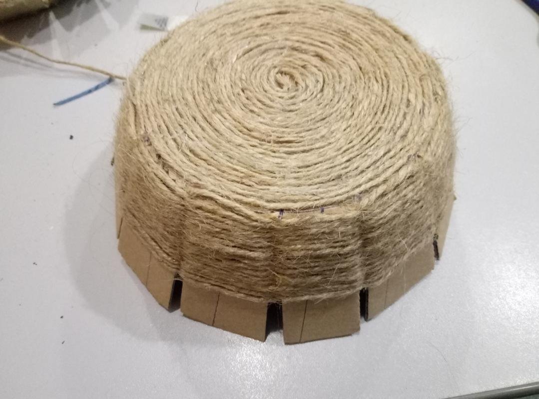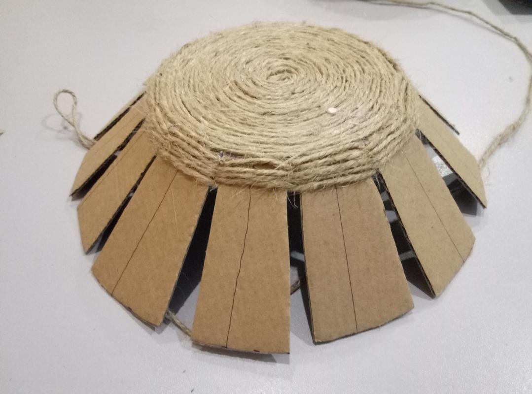 los círculos de cartón se pegan con papel kraft desde el exterior, desde el interior, con cinta adhesiva de doble cara;