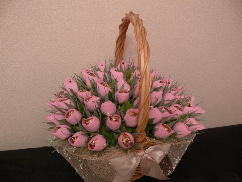 Para empezar, se corta una película oscura en cuadrados, con un lado de 14 cm, franjas claras de 6 por 45 cm y cuadrados de 12 cm. El asa de la canasta está trenzada con cinta adhesiva, un lazo se adhiere al lado con pegamento caliente. Desde el interior, el producto se pega con una película, se coloca una espuma cortada en forma de pirámide en la parte superior. Los cuadrados de la película se pliegan de modo que se obtienen 8 ángulos, el centro es perforado por un palillo de dientes. A continuación, se forma una flor, fijada con cinta adhesiva. Hay 22 de esas cosas, están montadas en los lados.El alambre floral está doblado por un lazo, pegado a una envoltura de caramelo. La película clara se fija con cinta adhesiva alrededor de cada dulce, se agregan dos cuadrados de oscuridad. Se insertan flores de caramelo en la espuma: el producto está listo.