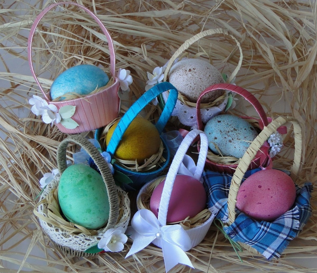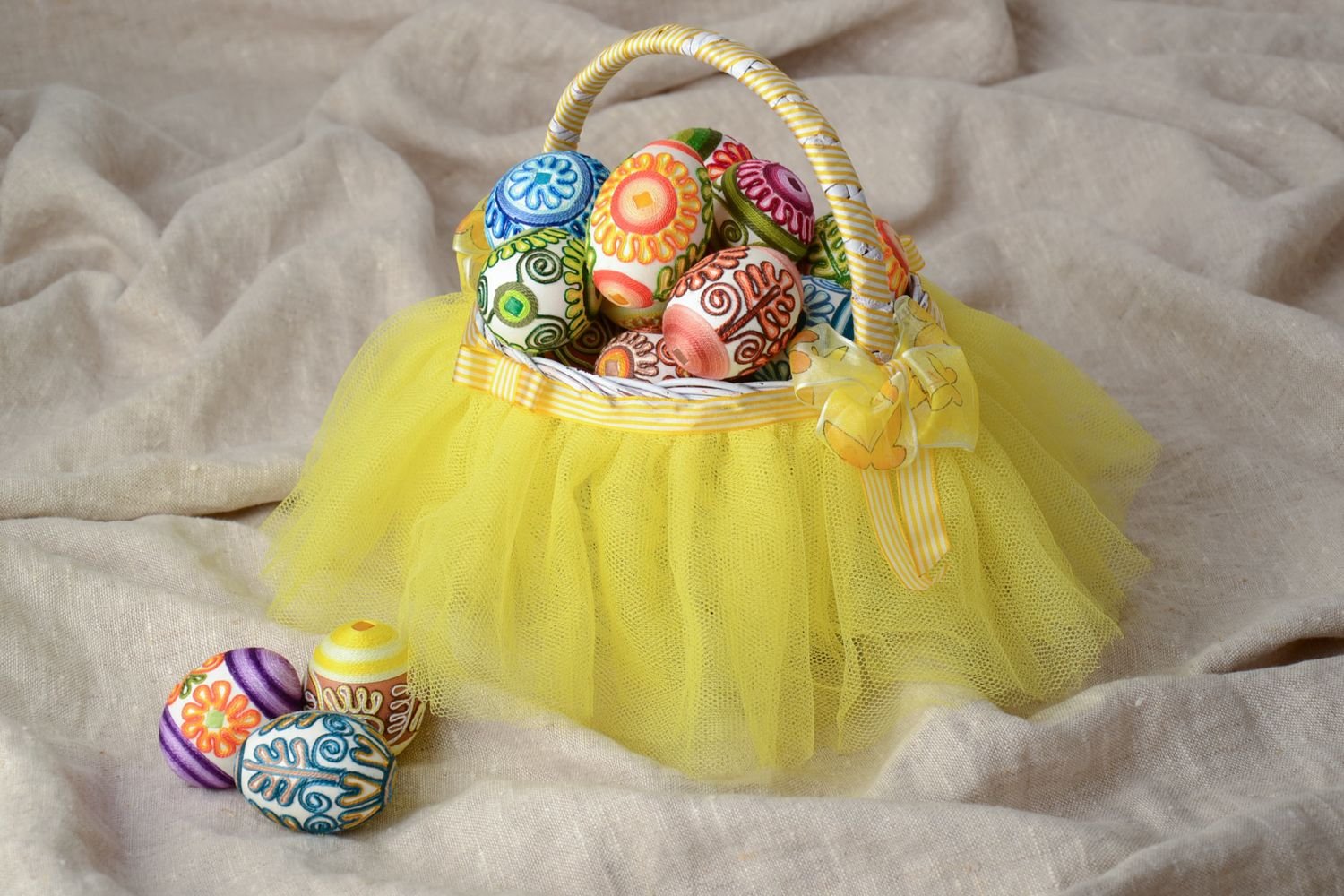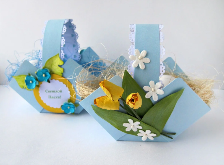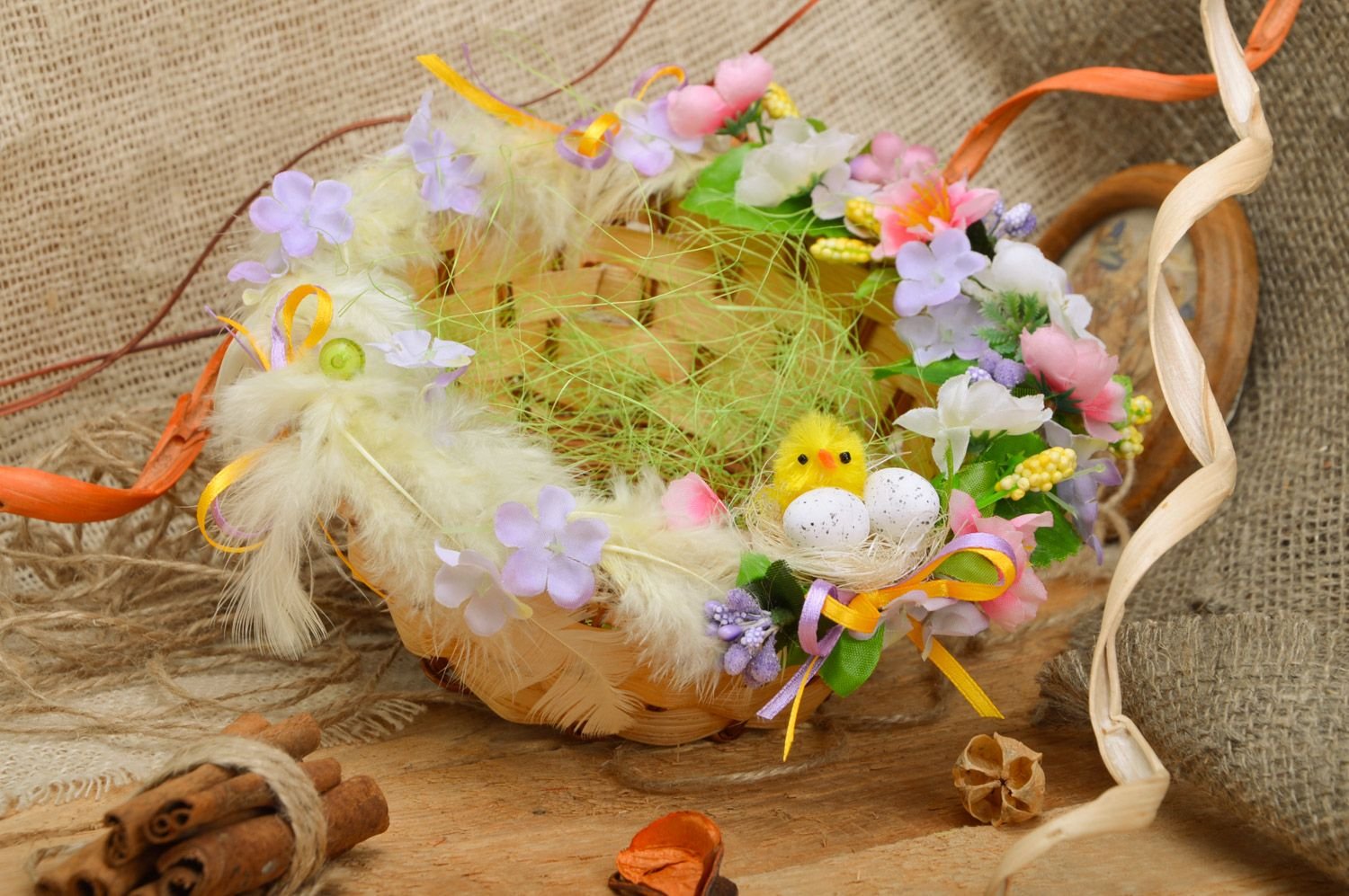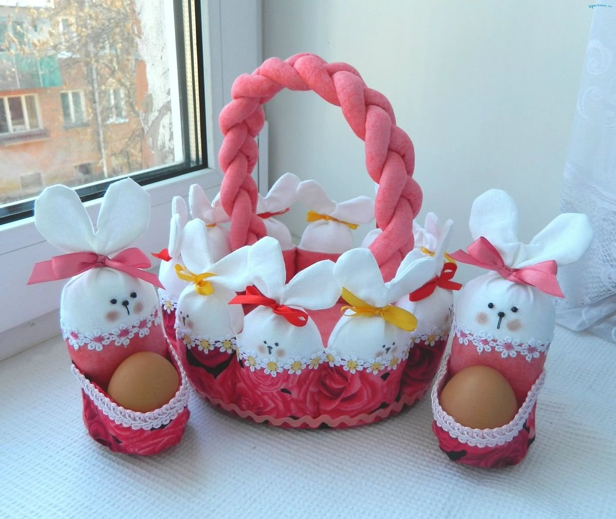 Uno de los principales símbolos de Pascua es un huevo en una canasta. A menudo, la composición se complementa con un pollo, un conejito. Este producto, hecho para Pascua, decorará la mesa navideña y a los niños les gustará. Lo realizan a partir de telas, hilos, tubos de periódicos, cordeles, enredaderas. Para la decoración se utilizan todo tipo de cintas, flores secas, ramitas, otros materiales naturales y artificiales.