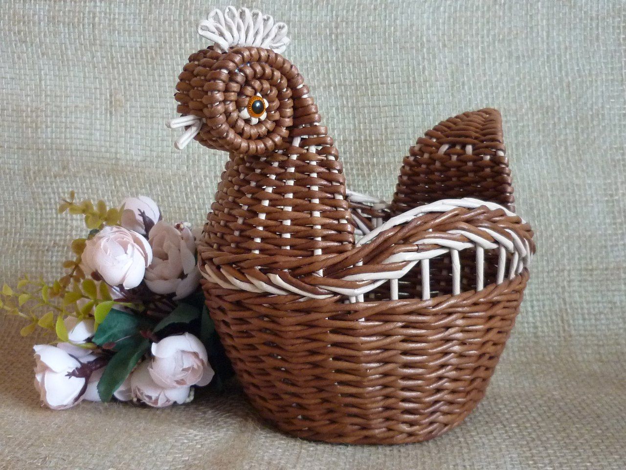 Una gallina de vides de papel está tejida, comenzando desde el fondo. Se toman al menos ocho tubos para esto, pero se agregan tantos en el proceso. Están trenzados por un tubo largo doblado por la mitad. Cuando se alcanza una altura adecuada, parte de los tubos va a la formación de la cabeza y el cuello del pájaro, el resto se convierte en la cola. Se dejan varias varillas a los lados de las cuales se hace un mango. La cabeza del pollo está decorada con un peine de cartón o textil, pico, pequeñas alas están pegadas a los lados.