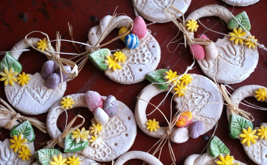 La masa salada es fácil de hacer a partir de tres partes de harina, dos partes de agua, una - sal. Comienzan a tejerlo a partir de "salchichas" de harina fina, que deben extenderse con un rodillo. Como base, se toma un frasco o una sartén, previamente engrasada. La masa se presenta en forma, el producto se voltea, enmarcado con un mango de coleta del mismo material. Ahora lo que sucedió se horneó durante dos horas en el horno a una temperatura de 100-110 grados. El artículo terminado está pintado con pinturas acrílicas. Un producto más complejo está decorado con flores voluminosas, hojas, racimos de uvas también moldeados a partir de masa, pero esto debe hacerse antes de hornear.