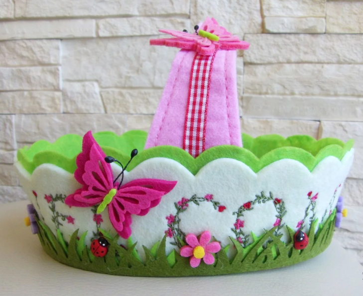 la artesanía terminada está decorada con bordados, el borde y el mango están envueltos con hilos de hilo brillante, rosas de fieltro en contraste, figuras de pájaros, etc. están cosidas.