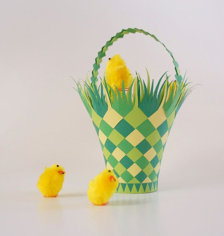 Para tejer una pequeña canasta resultará incluso de un vaso de plástico ordinario, más precisamente, de dos colores, preferiblemente diferentes. Uno se corta en tiras de centímetros desde abajo hacia abajo, el otro se teje en espiral en el primero. El mango está hecho de cartón corrugado. Hay otra opción: el vidrio se corta de la misma manera que el primero, pero no hasta el fondo. Las rayas están dobladas con anillos, el mango está pegado. El artículo está decorado con flores de papel de seda, pollos de piel, cintas de colores.