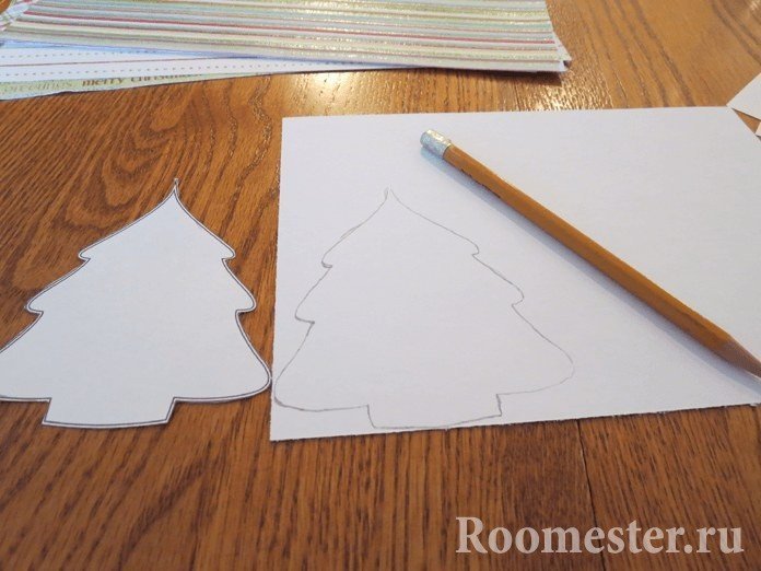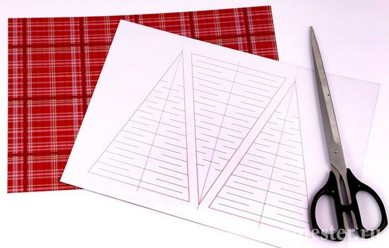 En el reverso de la hoja, dibuja triángulos isósceles. Pueden ser del mismo tamaño o diferentes. No es necesario hacer piezas demasiado altas o estrechas. Si el ancho de la base es de 10 cm, entonces los lados no deben tener más de 12-13 cm. Luego, es necesario hacer líneas de corte en varios niveles en el árbol. Los intervalos entre ellos deberían ser los mismos. La primera muesca (el lugar de la muesca futura) es una línea paralela a la base, que no alcanza los lados unos 0,5 cm. Al retroceder, dibuje dos muescas opuestas entre sí paralelas a la anterior, desde los bordes izquierdo y derecho. Naturalmente, no deberían converger en el medio. El siguiente serif repite el primero y así sucesivamente. Corta las partes a lo largo de las líneas dibujadas. En la parte superior, haz un agujero en el agujero a través del cual los árboles de Navidad se cubrirán con el cordón.