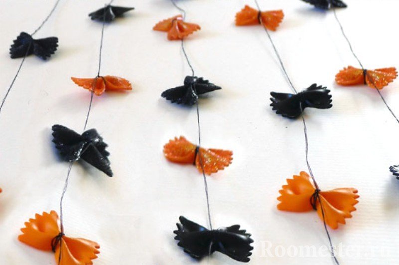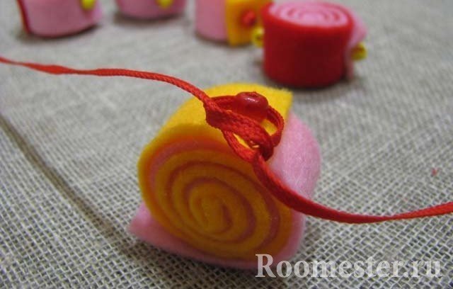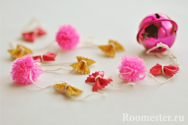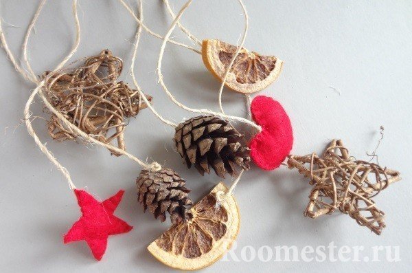 Tal guirnalda se puede hacer de dos maneras. Primero: corte una cuerda larga del largo que la decoración debe ser y ate muchos nudos. Pegue un elemento decorativo en cada uno. La segunda opción parece más interesante y voluminosa. Para cada elemento decorativo, corte adicionalmente cuerdas cortas de diferentes longitudes y úselas para sujetar las piezas al cable principal.