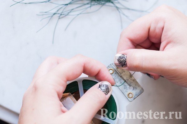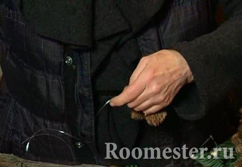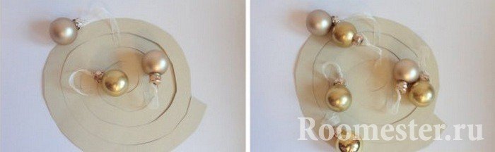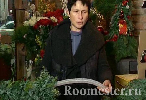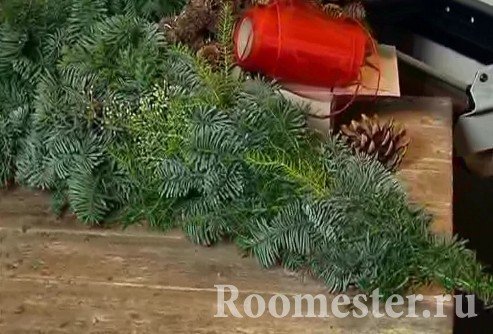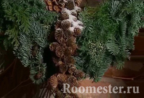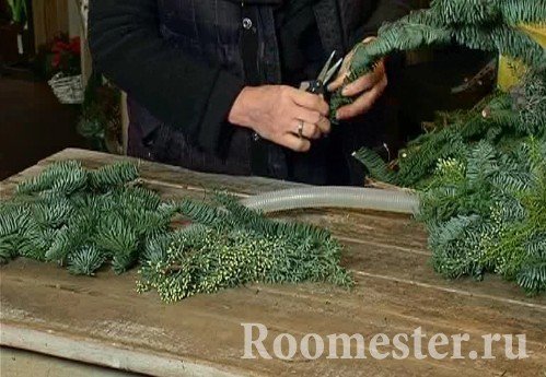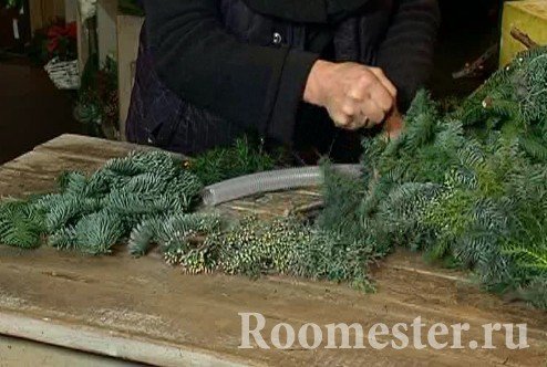 Corta las ramas de abeto y asegúralas a la tubería con alambre, como si estuvieran entrelazando una corona. En el transcurso del conjunto, agregue golpes y otra decoración.Decora una guirnalda confeccionada con nieve artificial.