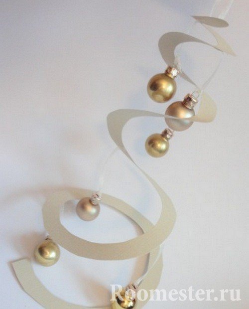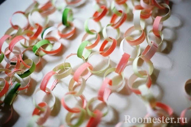 Esta opción es completamente sencilla, pero al mismo tiempo muy agradable. Es una tira de papel curvada. Muy a menudo, tales guirnaldas se fijan en el techo o en la pared, cuelgan como una serpentina. Para el trabajo necesitarás: