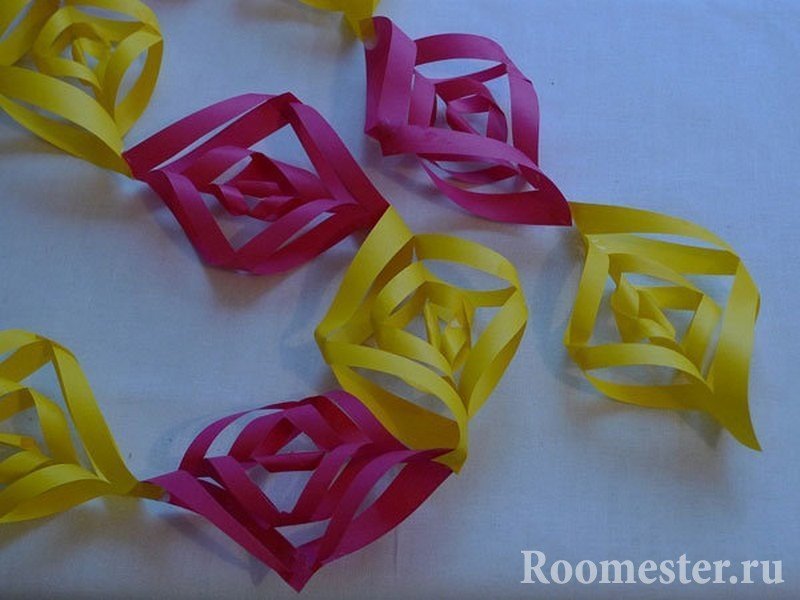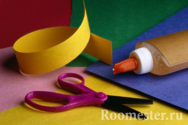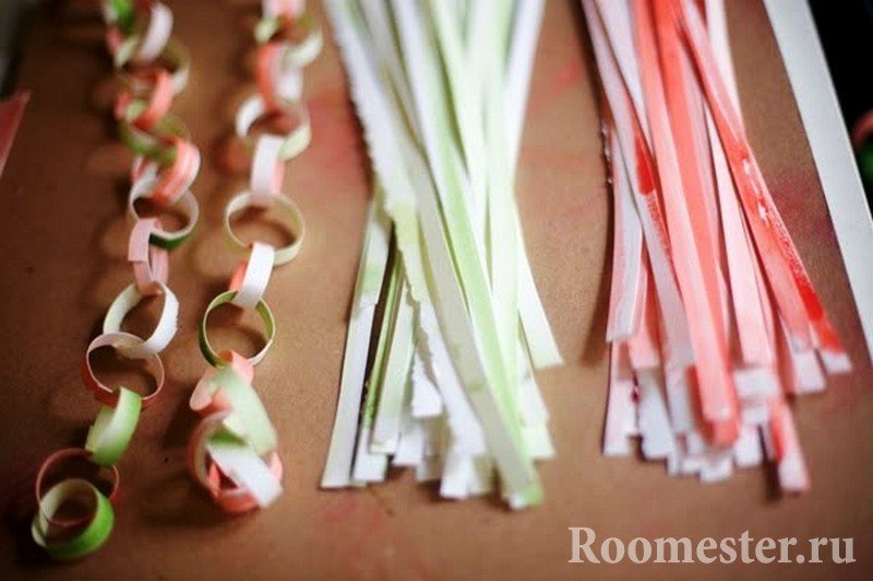Corte el papel en delgadas tiras idénticas de 0.5-1 cm de ancho, 6-10 cm de largo. De estas tiras pegue los anillos, uniéndolos. Asegúrese de alternar colores. Puedes decorar la cadena con banderas de papel o linternas.