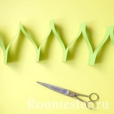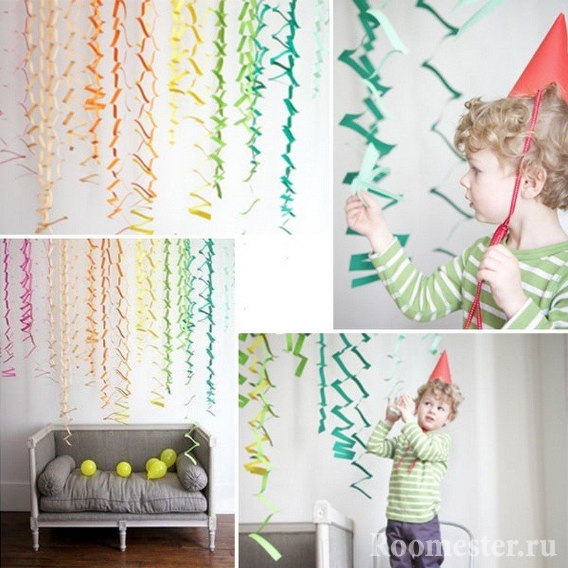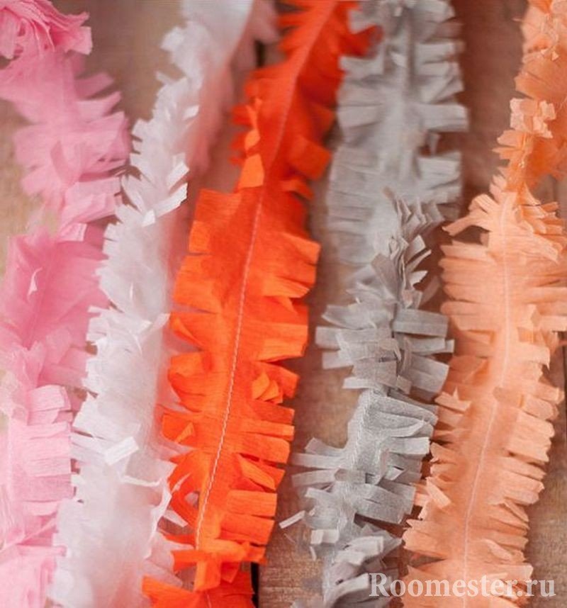 Corte tiras de papel de color con un ancho de 10-15 cm. En cada lado, haga cortes en incrementos de aproximadamente 2 cm, sin cortar hasta el final 1-2 cm. Gire la tira entre los cortes ya preparados, haga lo mismo solo en el otro lado, también no llegando al borde El resultado es una guirnalda en blanco en forma de cinta cortada con tijeras en ambos lados. Estira la tira resultante. Si se necesita una cinta más larga, conecte varios elementos. La decoración se ve hermosa cuando se preparan varias cintas largas de diferentes colores.