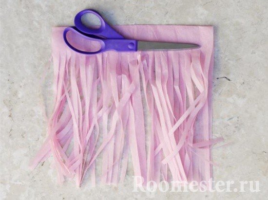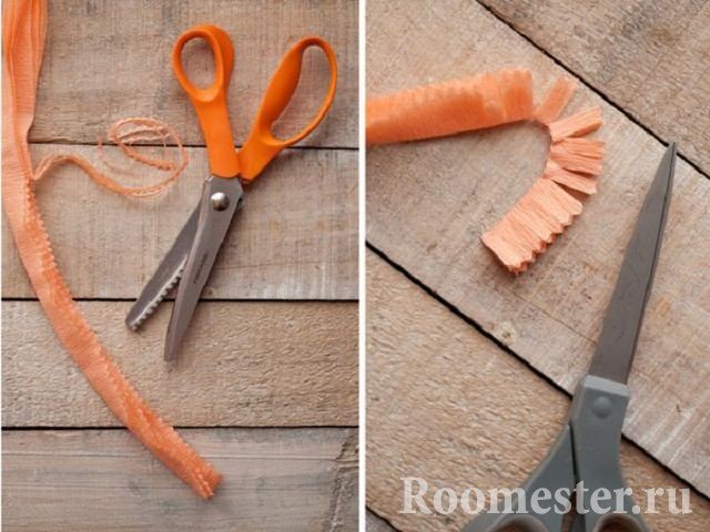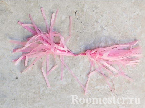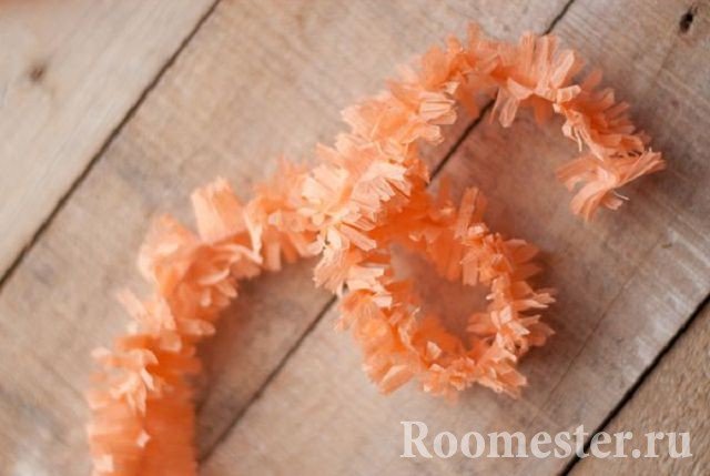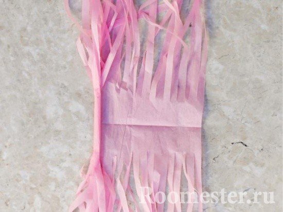 Corte todo el rollo en varios rollos pequeños con un ancho de 5-10 cm, dependiendo del ancho deseado del producto terminado. Estírelos para obtener cintas largas. Dobla unas cuantas cintas y cose en el medio en una máquina de coser. En los bordes, haga muchas incisiones pequeñas con tijeras ordinarias o rizadas. Lo principal en este trabajo es no dañar el medio. Luego endereza el flequillo, tratando de no estirarlo demasiado. Obtén una decoración aireada y esponjosa. En la fabricación de una guirnalda, puede conectar cintas de diferentes colores, luego resultará más brillante.