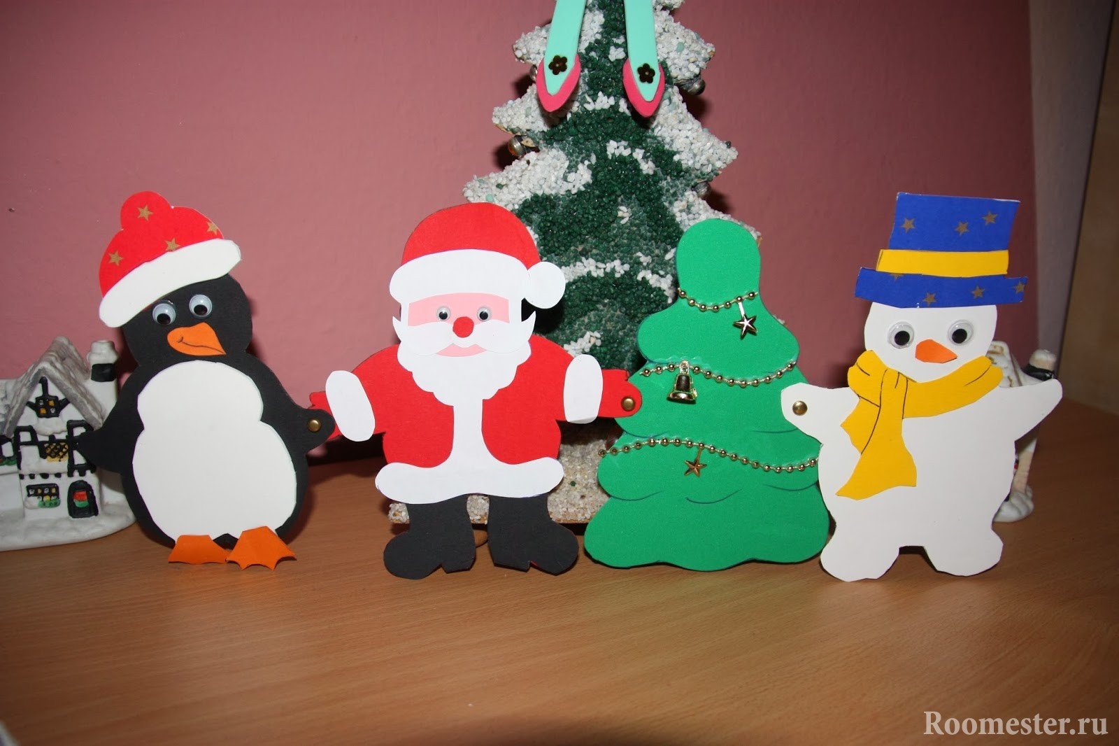 Las guirnaldas se ven muy interesantes en forma de un baile redondo, que es presentado por Santa Claus, Snow Maiden, Snowman, Christmas tree y otros personajes de Año Nuevo. Los héroes se pueden realizar de forma independiente en forma de aplicaciones. Lo principal es que sus manijas se colocan a un lado, para que las piezas se puedan sujetar. Si es reacio a molestarse con la fabricación, busque imágenes preparadas en Internet, imprímalas en una impresora a color y recórtelas. Es mejor conectar las piezas con un cable delgado o remaches especiales para que permanezcan móviles.
