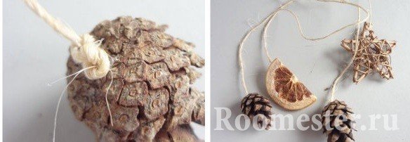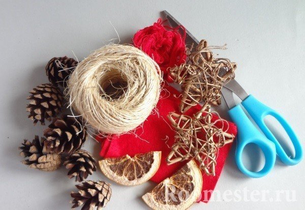 Hacer una guirnalda de este tipo es muy simple, solo tienes que recoger los conos de antemano y preparar rodajas de naranja. Los cítricos se cortan en rodajas finas y se secan al aire libre o en el horno. Las guirnaldas de este tipo generalmente se recogen en una cuerda de cáñamo. Para el trabajo necesitarás: