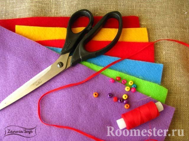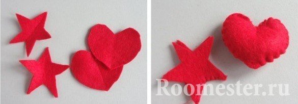 Se necesita fieltro para cortar las figuras. Pueden ser planas o voluminosas. En el segundo caso, tendrá que cortar dos partes idénticas y coserlas juntas, llenando el interior con algodón u otro material suave.