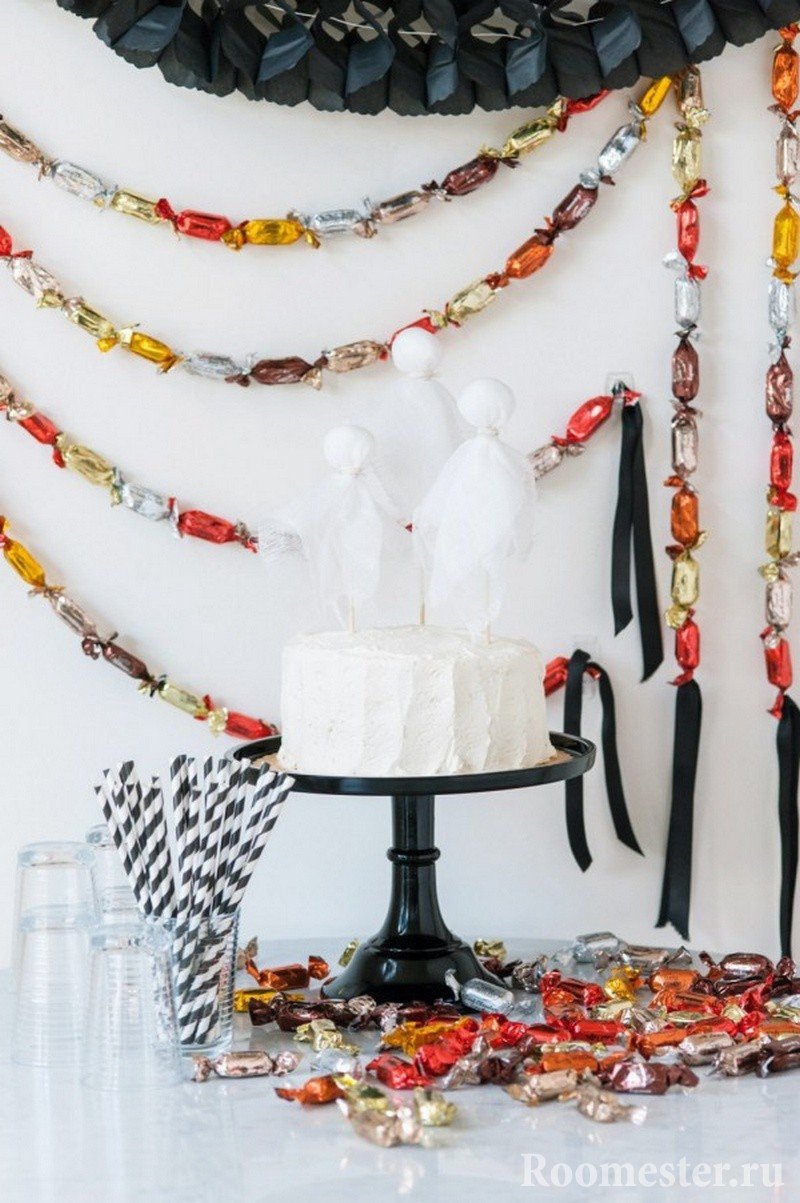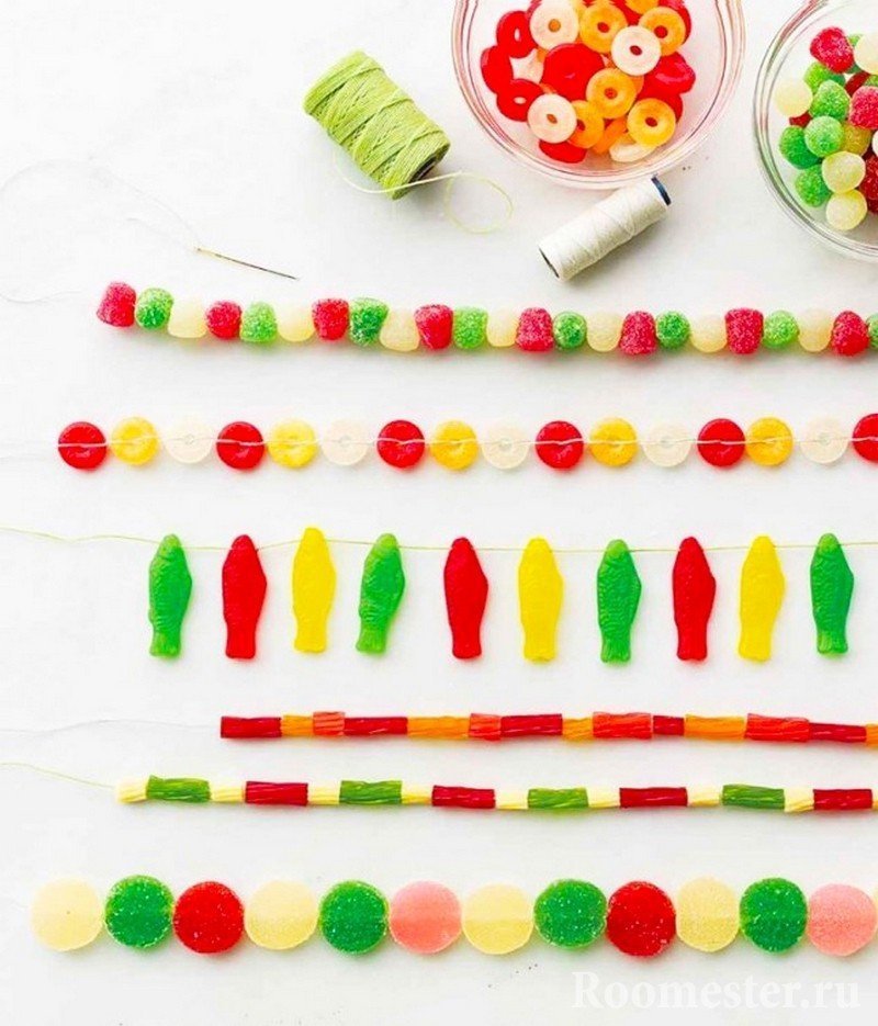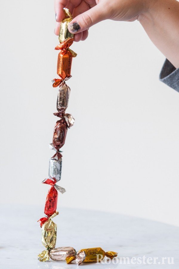 El tercer método es el que consume más tiempo, pero también parece mucho más interesante. Para una guirnalda, prepare una cuerda larga del largo que debe ser la decoración terminada. La cuerda debe ser lo suficientemente gruesa como para soportar el peso de todos los dulces. Usando cuerdas más delgadas o cintas de diferentes longitudes, ate cada caramelo por separado al cable principal. En este caso, cuanto más variado sea el dulce, mejor.