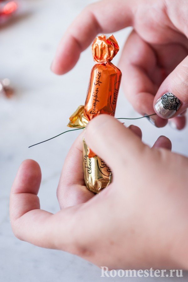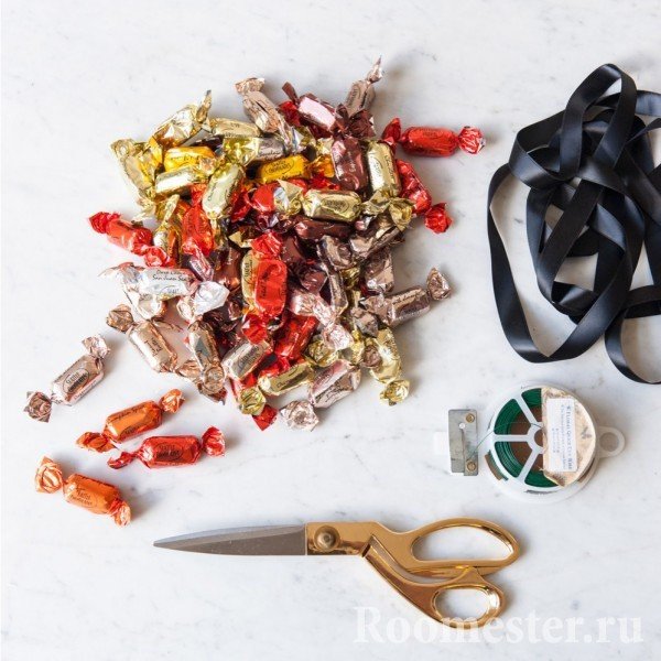 Sujete las coletas de dulces entre sí utilizando una engrapadora o alambres cortos y delgados. Para que la decoración se vea armoniosa, es mejor usar dulces del mismo tamaño, pero de diferentes colores.