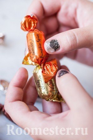 El segundo método es la unión separada de dulces usando una cuerda cortada en trozos pequeños. Conecte los dulces atando uno por uno para que entre las colas del envoltorio de dulces haya un trozo de cuerda.
