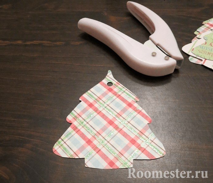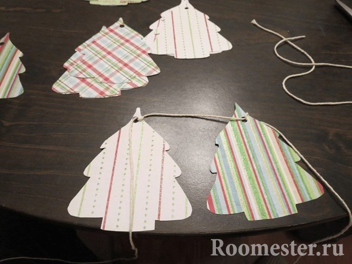 En la parte posterior del cartón de color, encierre en un círculo la plantilla preparada y corte el número requerido de abetos a lo largo del contorno. Haga un agujero en la parte superior de cada parte con un perforador. Pon todos los árboles de Navidad en la cuerda. Pase la cuerda dos veces a través de cada agujero. Entonces las partes planas serán más estables, no se moverán hacia abajo del cordón y se desviarán hacia los lados.