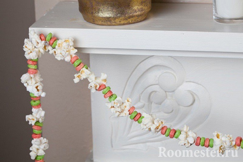 Pase las palomitas de maíz, alternando con rizos de cereales para el desayuno. No es necesario observar ninguna secuencia, los elementos se pueden encadenar de manera caótica.