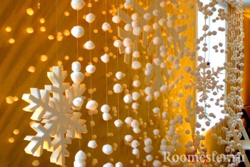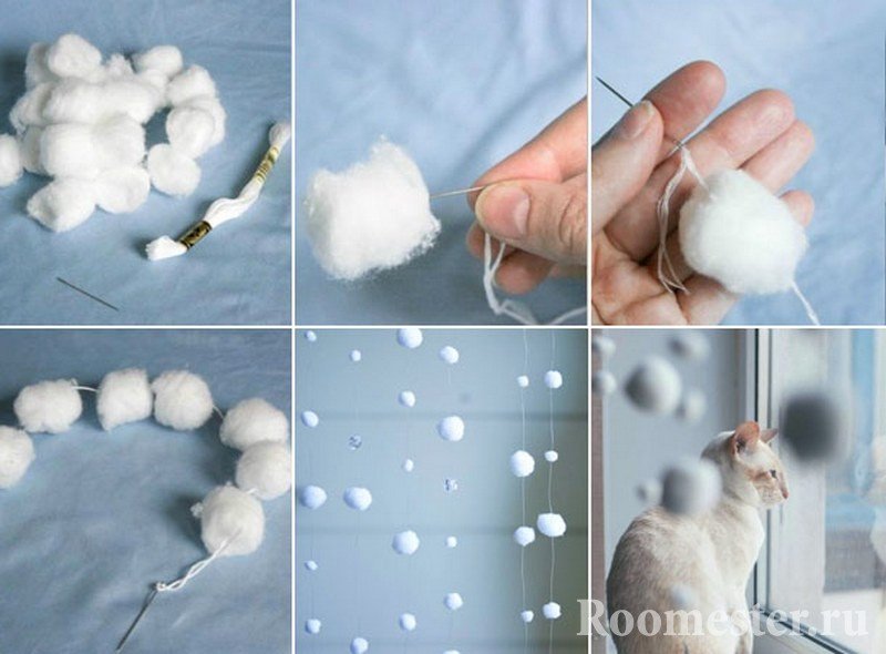 Una versión muy interesante de una guirnalda vertical que parece una nevada real. Esta decoración puede decorar una ventana o un candelabro sobre la mesa festiva. Para nevar necesitarás: