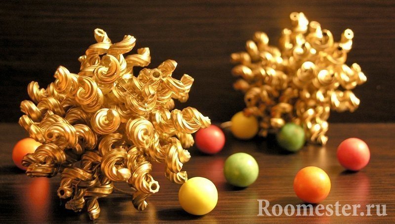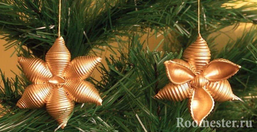 Recientemente, los juguetes navideños hechos de pasta rizada se han vuelto muy populares. Son fáciles de hacer con sus propias manos, y pintadas en color dorado o plateado, se ven como una decoración cara. Hay muchos ejemplos de cómo hacer varios copos de nieve en Internet, y si haces varios y los unes a cuentas de pasta, obtienes una maravillosa guirnalda. El hilo en el que se unirán las joyas debe ser lo suficientemente fuerte.