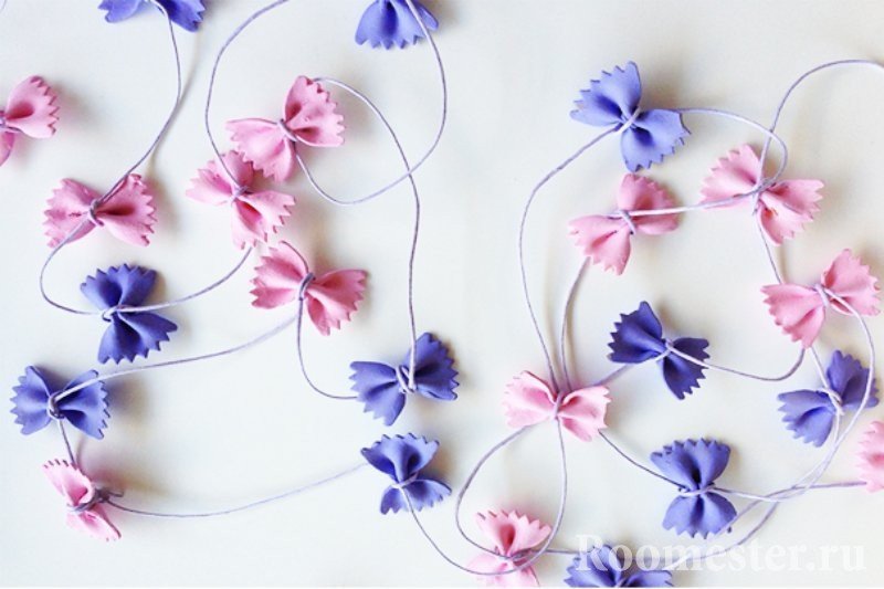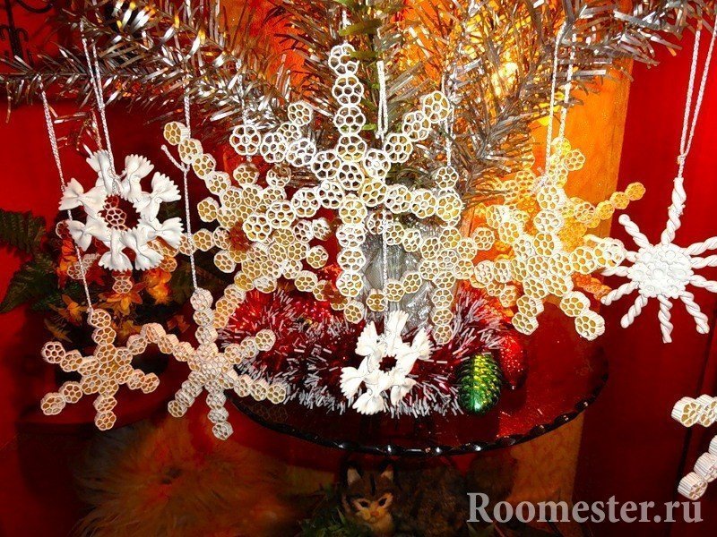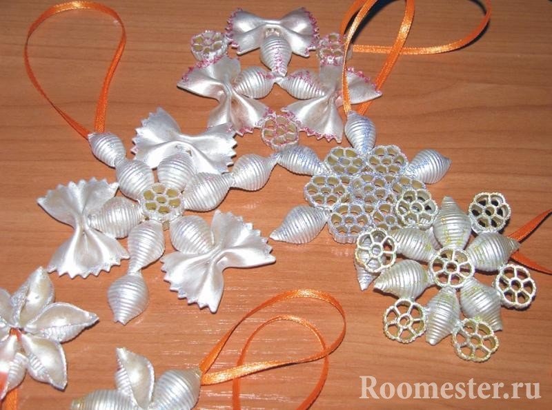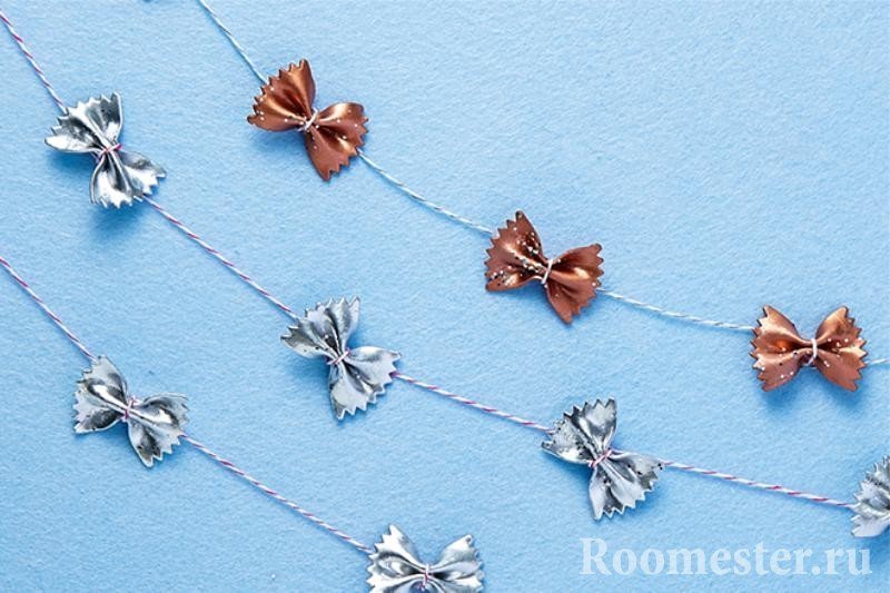 Haga un pequeño bucle y ensarte la pasta en la cuerda hasta que las "cuentas" lleguen a la longitud requerida. Completa la guirnalda con cuentas, cintas, lazos y, por supuesto, copos de nieve de pasta.