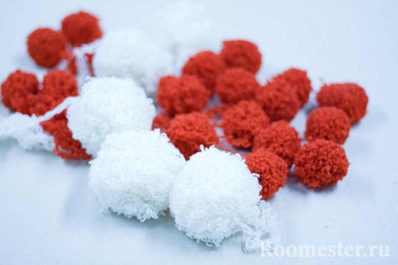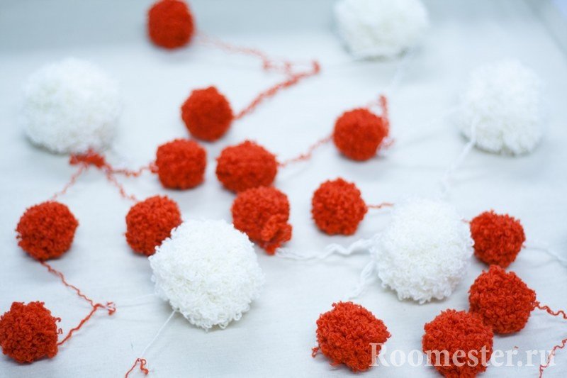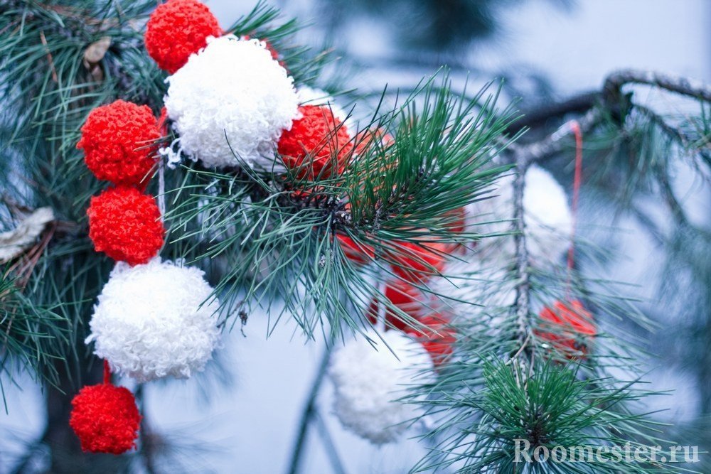 Suaves y cálidas guirnaldas de pompones pueden decorar todo, comenzando con un árbol de Navidad y terminando con una ventana. Para el trabajo, necesitará varias madejas de hilo de colores o un par de suéteres aburridos.