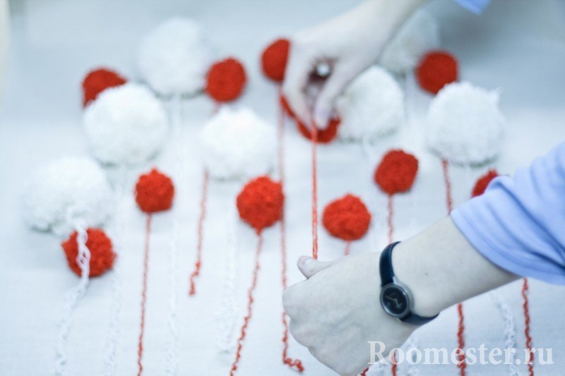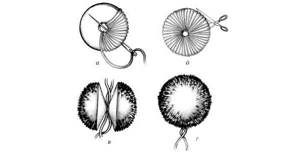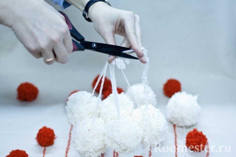 Haga pompones de cualquier manera conveniente.La opción más fácil y rápida está en los dedos. Envuelva el hilo alrededor de dos o tres dedos de su mano, luego, sin quitarlo de sus dedos, ate el lazo en el medio, dividiéndolo en dos partes iguales. Deje el hilo del apósito largo. Más tarde, usándolo, se conectarán elementos individuales. Corta los lazos alrededor de los bordes. Cuantos más hilos enrollen, más esponjoso será el pompón. Los pompones pueden ser de diferentes tamaños y colores. La base puede ser un torniquete o una coleta de los mismos hilos de los que se hicieron los pompones.