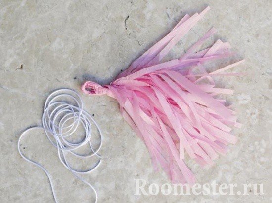 Para la fabricación de cepillos, es necesario preparar piezas rectangulares. Dobla la servilleta en una capa y córtala por la mitad. Dobla el rectángulo resultante por la mitad. Haga pequeños cortes en el lado opuesto al doblez. Reemplace la tela. El resultado debería ser un rectángulo con una franja en ambos lados. El medio permaneció intacto. Comenzando desde el borde largo, gire la pieza de trabajo con un tubo y luego gire el centro con un torniquete y doble por la mitad. El resultado debería ser un bucle con una cola esponjosa. Listo cepilla la cuerda en la cinta preparada. Para evitar que se resbalen, abroche cada nudo durante la secuencia.