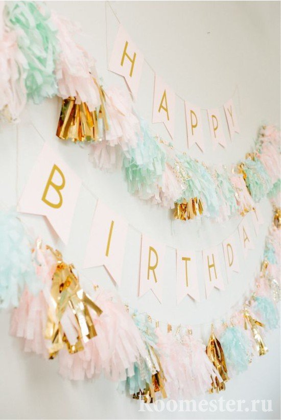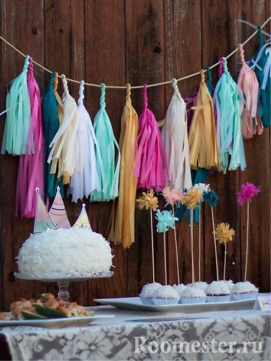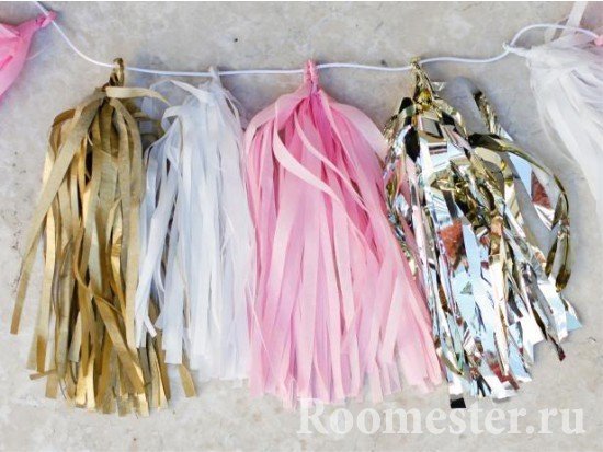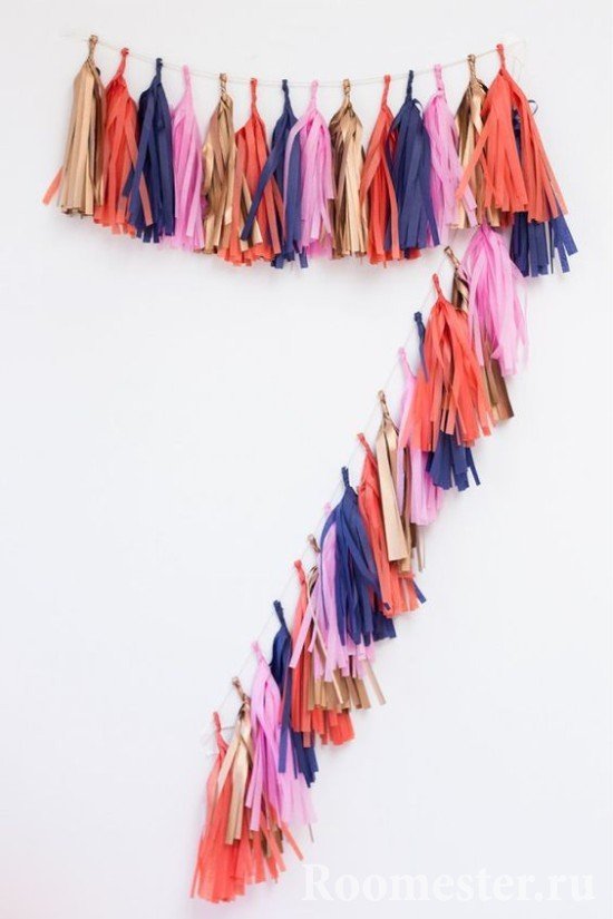 Las guirnaldas con borlas tradicionalmente decoran cumpleaños y bodas, pero no hay duda de que puede ser una decoración maravillosa para el interior de Año Nuevo. Los pinceles pueden estar hechos de papel corrugado, papel especial en silencio o servilletas comunes. Necesitarás: