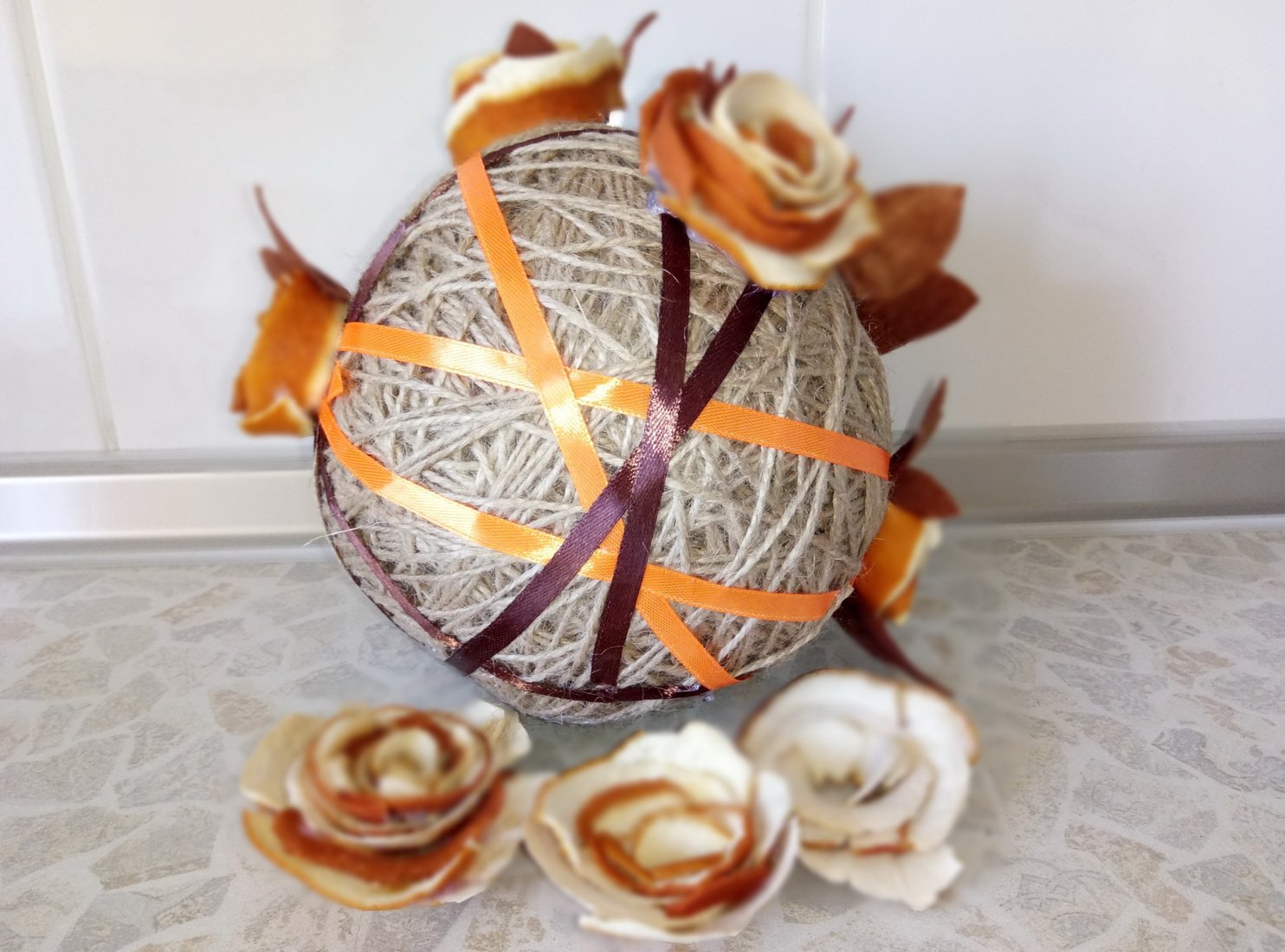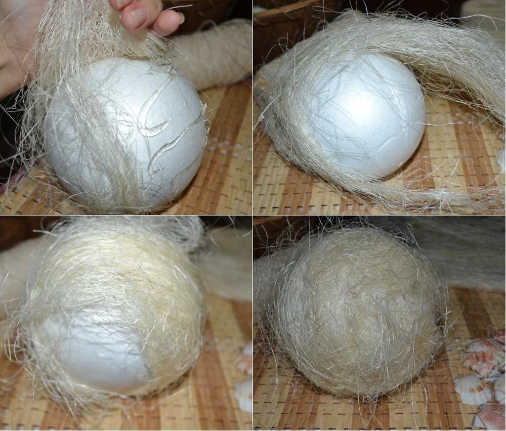 La base esférica para la corona se puede comprar en la tienda o se puede hacer con sus propias manos. La opción de compra será de espuma. Gracias a una gran variedad de tamaños y grados de densidad, esta es la forma más fácil de seleccionar la forma perfecta. Para evitar que la bola se derrita al contacto con el pegamento, se envuelve con hilo.