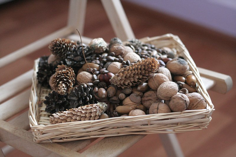Puede comenzar a recolectar material para manualidades de temporada desde mediados de verano. Durante este período, la mayoría de los árboles frutales producen cultivos, los frutos aparecen en castañas, robles y abetos. Puede obtener una cantidad suficiente de semillas, semillas, conchas simplemente paseando por la plantación forestal, el parque o en su propio jardín.