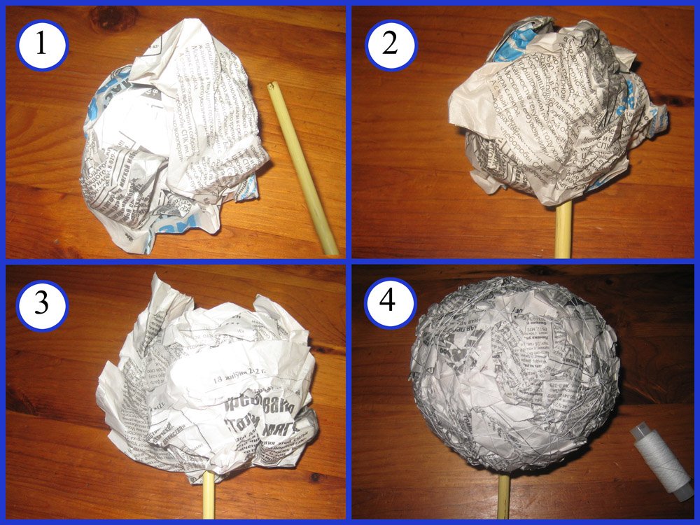 Papel Cubrimos la hoja con pegamento PVA, la trituramos en una bola apretada. Luego, agregue gradualmente tiras de papel hasta obtener una bola del tamaño correcto. Pegue los bordes sobresalientes y envuelva la pieza de trabajo con un hilo denso.