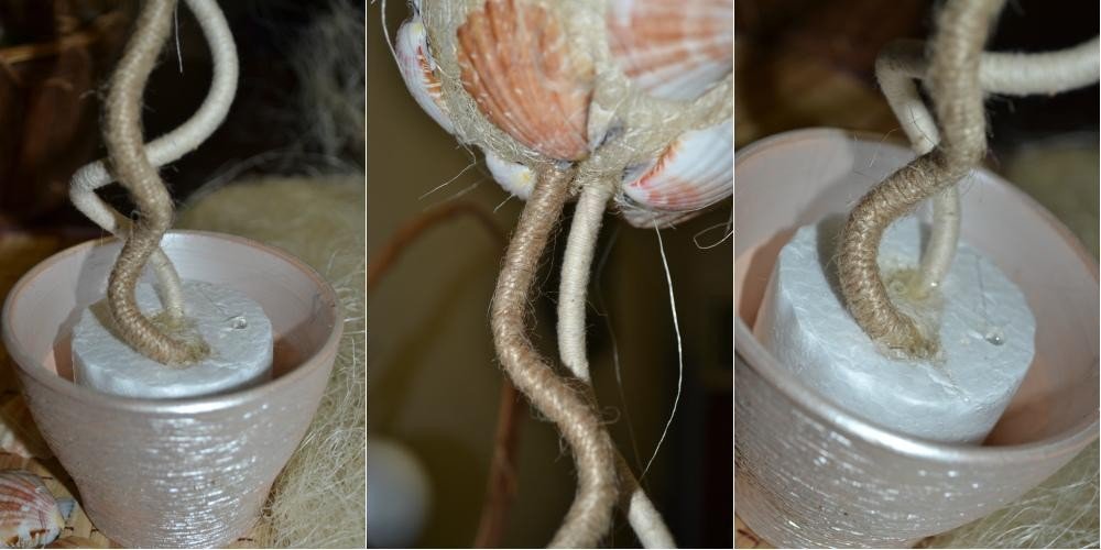 Puedes mezclar la mezcla directamente en la olla. Debe ser lo suficientemente grueso como para sostener bien la nave en forma de bola. Coloque el barril preparado y pintado en la masa líquida, deje secar la olla hasta que la humedad se evapore (3-12 horas). Luego decoramos la base con bolas de sisal.