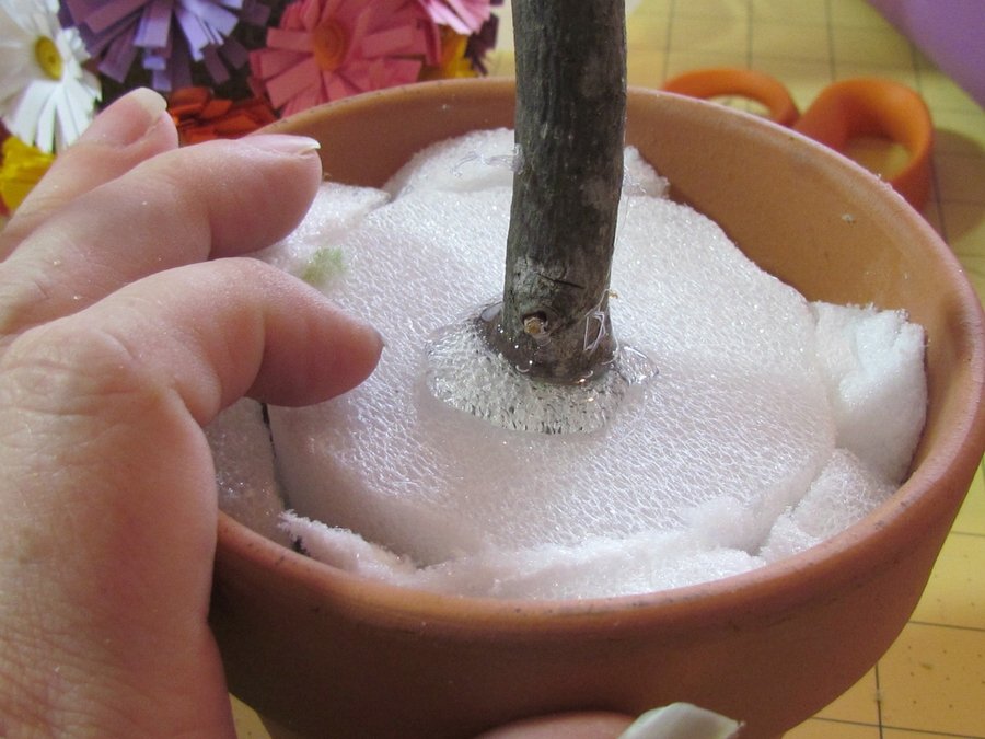 En primer lugar, debes hacer un marco sólido de manualidades. Para hacer esto, llene la maceta con espuma, apóyela bien e inserte la rama. En el otro extremo nos ponemos una bola de espuma. Las grietas resultantes pueden rellenarse con una pistola de pegamento o dejarse como están. El peso del topiario de las hojas será pequeño, por lo que no debe temer la caída de la estructura.