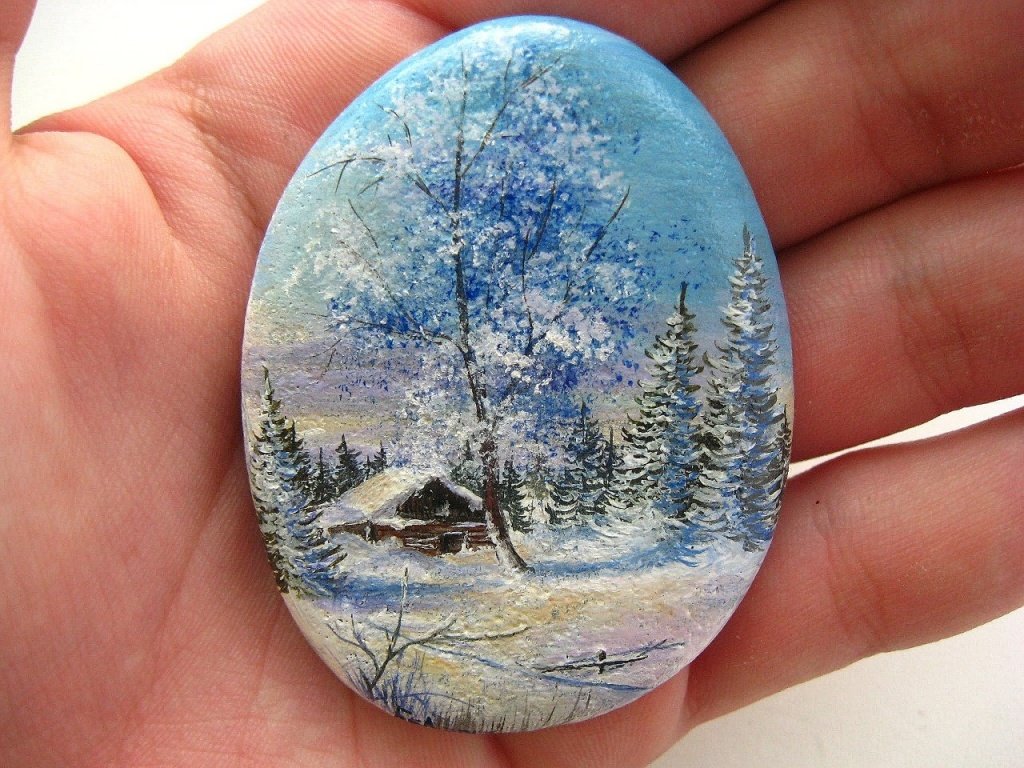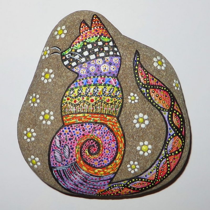La pintura se puede hacer simplemente sobre guijarros (sin base) o sobre una imprimación blanca. Las colecciones con dibujos de pintura blanca realizados en los mismos guijarros gris-marrones (o con el mismo color posible) se ven muy bien.