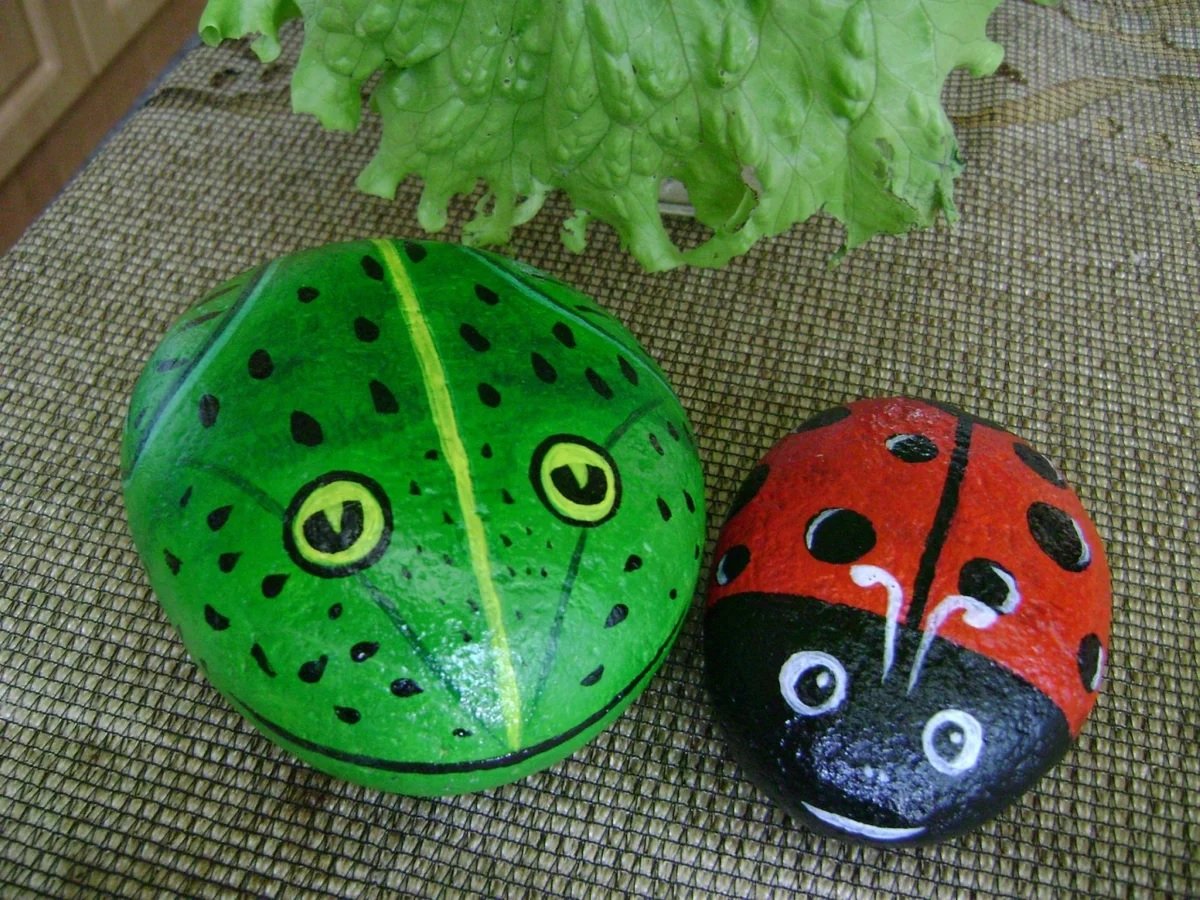 De un par de guijarros pequeños planos y uno grande, puedes hacer una rana simple. Además, después de dibujar a los pequeños hombres en grandes piedras volumétricas y pegarles el cabello de hilos de tejer, puedes obtener bonitas muñecas de piedra.