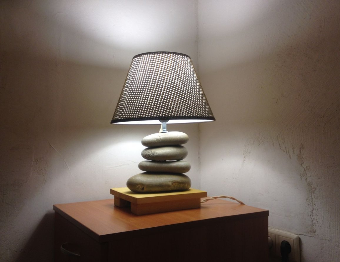 La pata de la lámpara (o la parte inferior del soporte) se puede pegar con una variedad de piedras.Es cierto que esta opción es más adecuada para lámparas de mesa en color gris-marrón, beige o café.