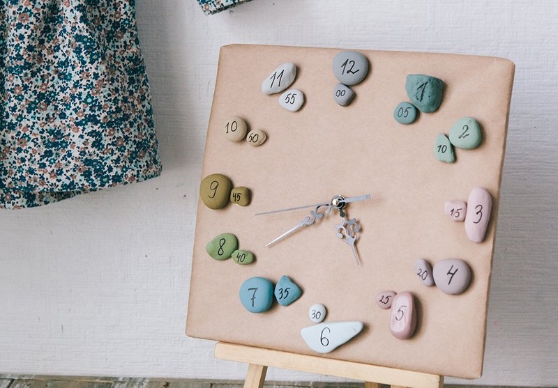 Usando piedras, puede actualizar fácilmente el marco del reloj. Para hacer esto, las piedras de diferentes tamaños deben estar pegadas alrededor del perímetro (o círculo). Las conchas pegadas ayudarán a hacer que este reloj sea "marino".