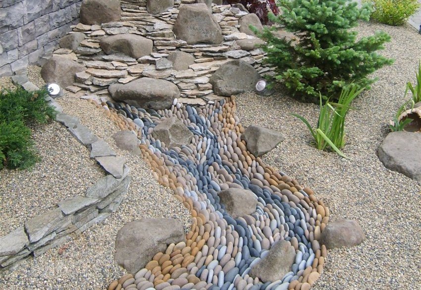 Piedras de colores (o, por ejemplo, cuarzo blanco y rosa) se utilizan para decorar parterres. Los guijarros se colocan entre plantas individuales, arbustos. La ventaja de esta decoración es la protección adicional contra las malas hierbas.