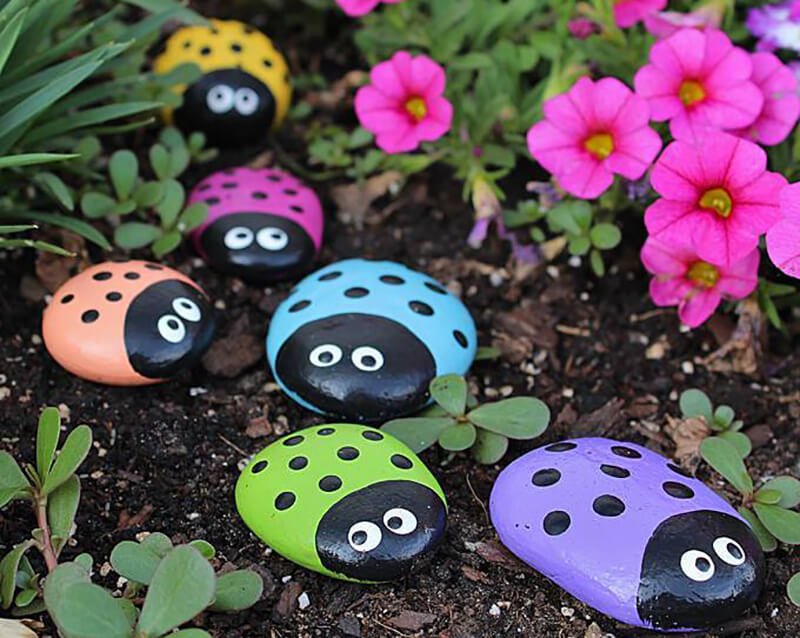 Otra forma de decorar guijarros de mar y río es pintarlos. Se recomienda realizar el trabajo con pinturas acrílicas: se secan rápidamente, no se lubrican con una capa protectora de la embarcación con barniz. Puede dibujar en las piedras cualquier patrón: rayas, puntos, rizos. Para crear manualidades simples para niños, puede elegir motivos más inusuales, por ejemplo, hacer tales colecciones: