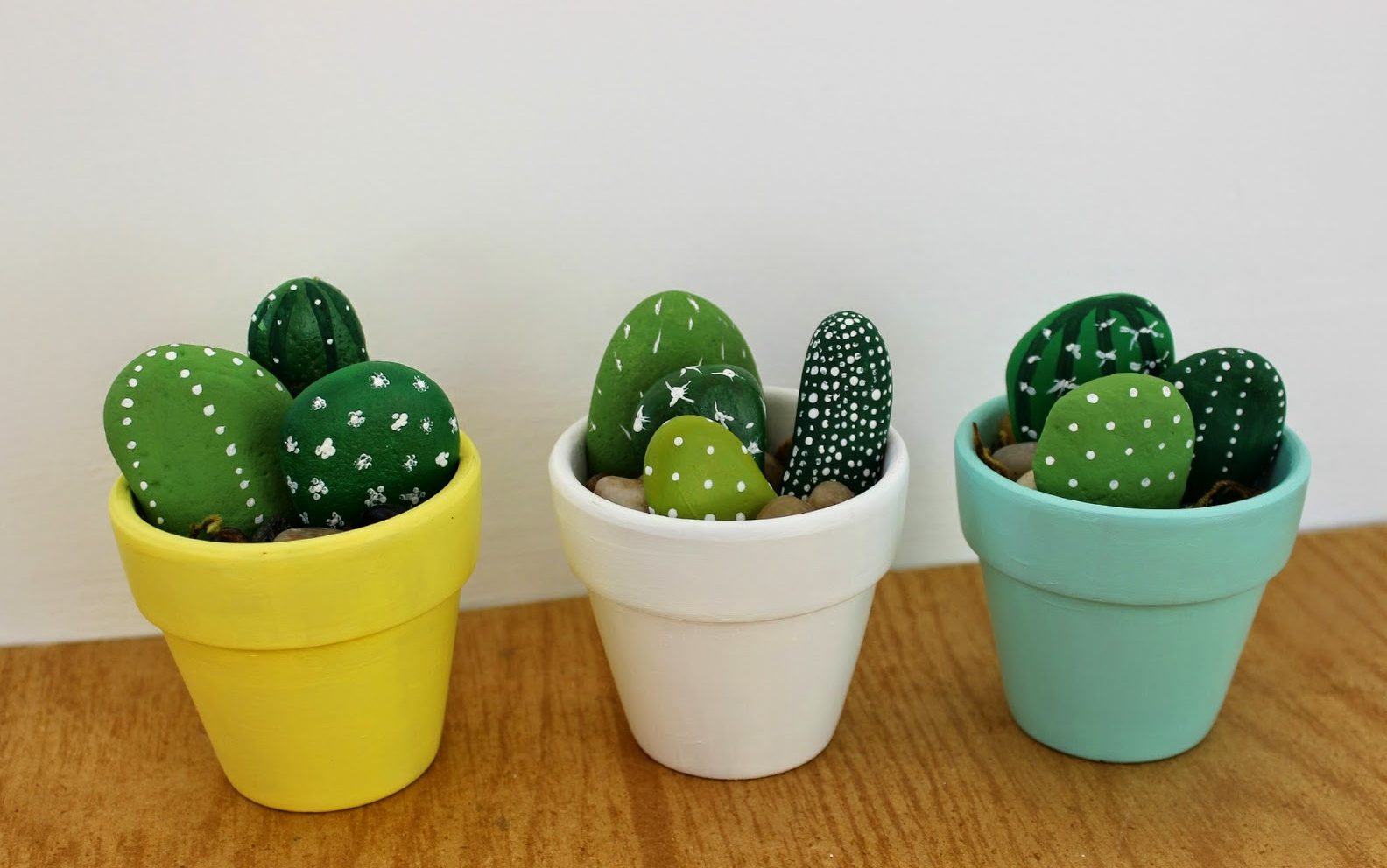 Después de pintar los guijarros en verde y rosa, los colores amarillos pueden hacer lindos cactus. Se recomienda instalarlos en una maceta. Después de haber colocado varias piedras cerca y haber hecho un patrón general sobre ellas, puede hacer una bonita decoración de mesa en forma de un "rompecabezas" de piedra.