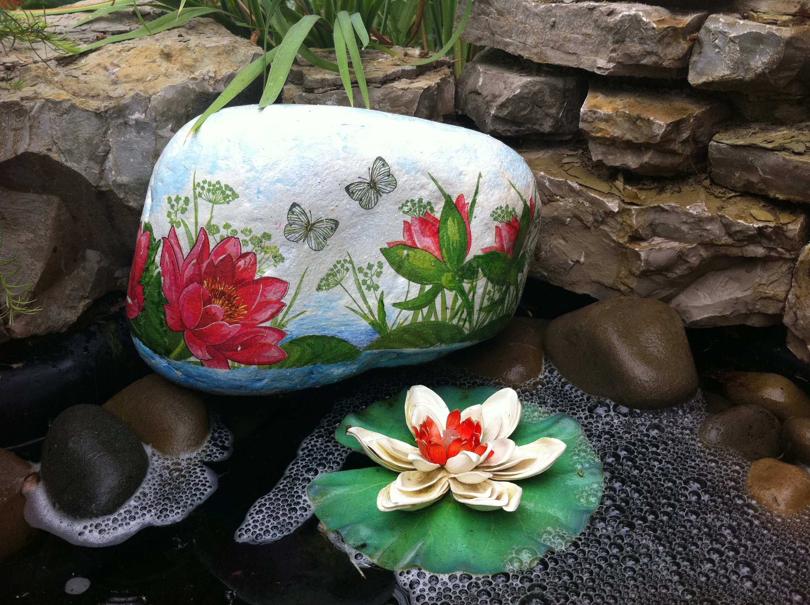 Habiendo pintado previamente las piedras en diferentes colores, puede realizar aplicaciones en forma de orugas, mariposas, flores.