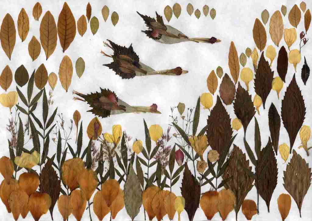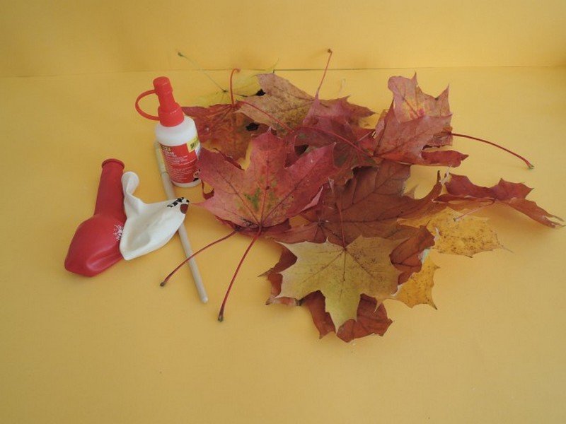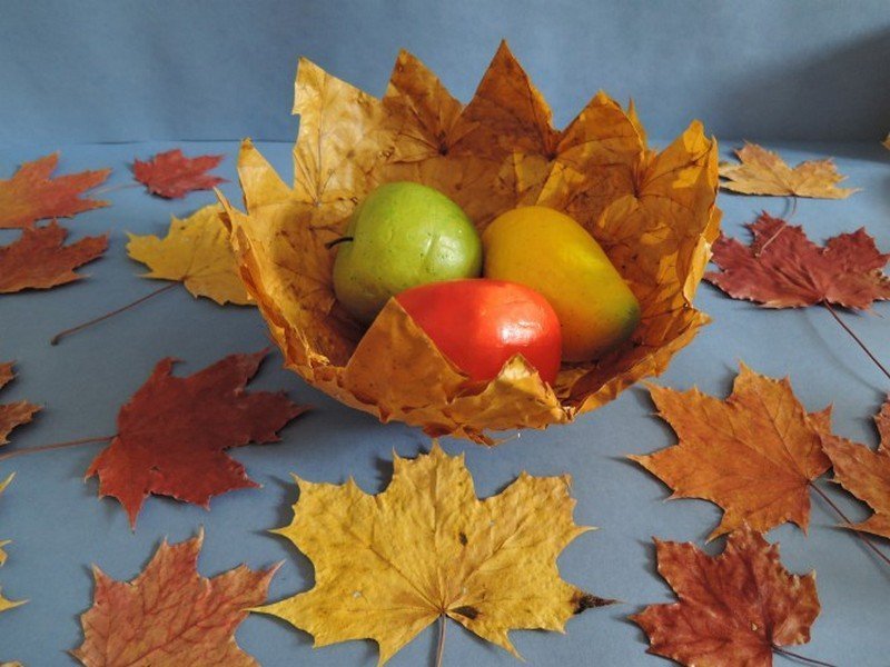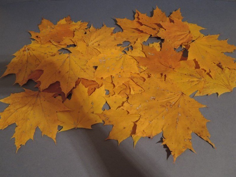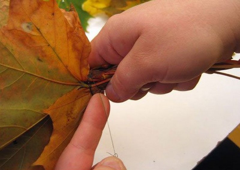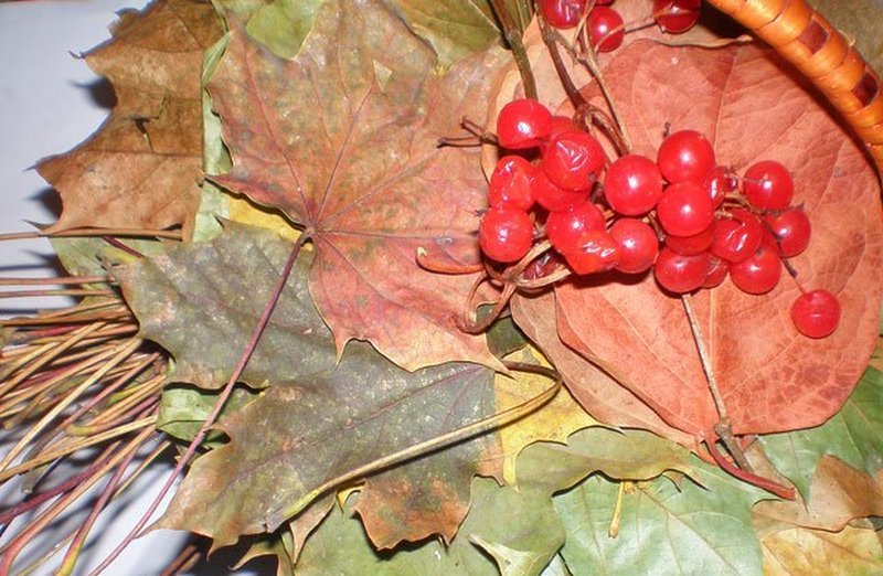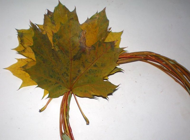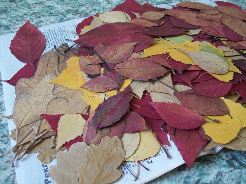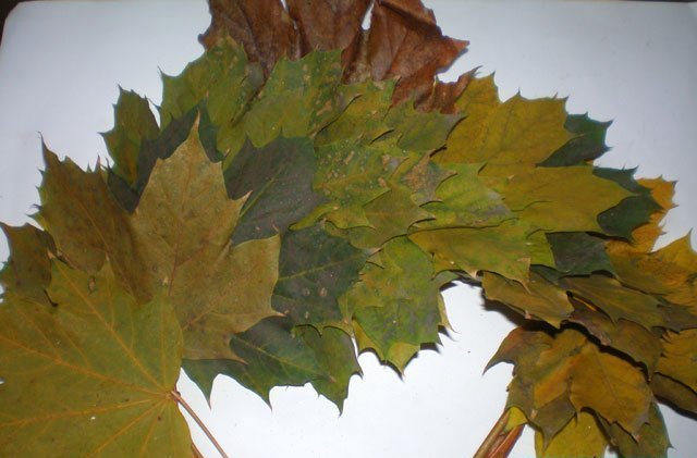 Durante la mayor parte del trabajo, recolectan hojas aún frescas que han conservado su flexibilidad. El arce es considerado el "rey" entre las artesanías de otoño. Sus hojas tienen una forma original y se ven hermosas incluso en su forma cruda. Oak está en segundo lugar en términos de complejidad de forma. Sin embargo, este árbol es raro en los parques urbanos, por lo que los poderosos gigantes deben buscarse en el bosque o en el claro. Después de las hojas de roble, los abedules ocupan el tercer lugar. El abedul es un símbolo "ruso" que crece a lo largo de las carreteras y limita con campos ilimitados. Sus hojas tienen una forma bastante simple, pero al mismo tiempo complementan composiciones complejas, desempeñando el papel de detalles de fondo. Se combinan perfectamente con "aretes", conos y bellotas (uno más de los participantes de las composiciones). Las ramas de fresno de montaña, nogal, fresno, carpe, sauce, espino amarillo están decoradas con las mismas hojas pequeñas, ligeramente alargadas. Después de recoger el material debe estar preparado. Las hojas se lavan a fondo incluso si no parecen sucias a la superficie. Es suficiente enjuagar en un recipiente con agua jabonosa. Después de eso, las hojas se secan. Ahora puede trabajar con seguridad con el material. Si te entristece la corta vida de la nave, entonces su juventud puede extenderse con la ayuda de una solución caliente de glicerina. Las hojas se bajan al líquido y se dejan durante una semana. La solución se absorbe durante mucho tiempo. Una capa de glicerina parece preservar el mesofilo (tejido de la hoja), prolongando su vida como decoración.