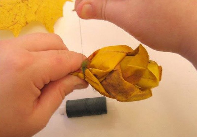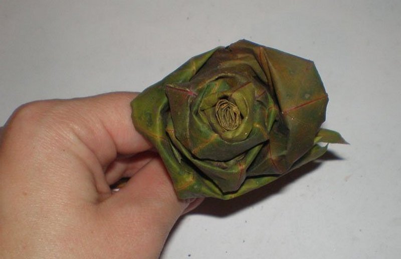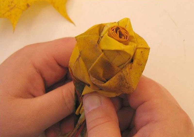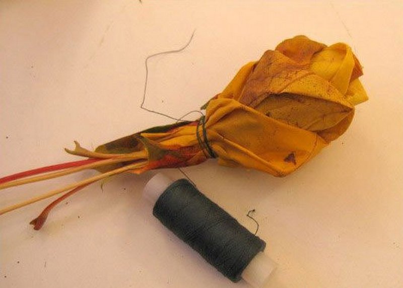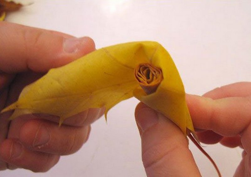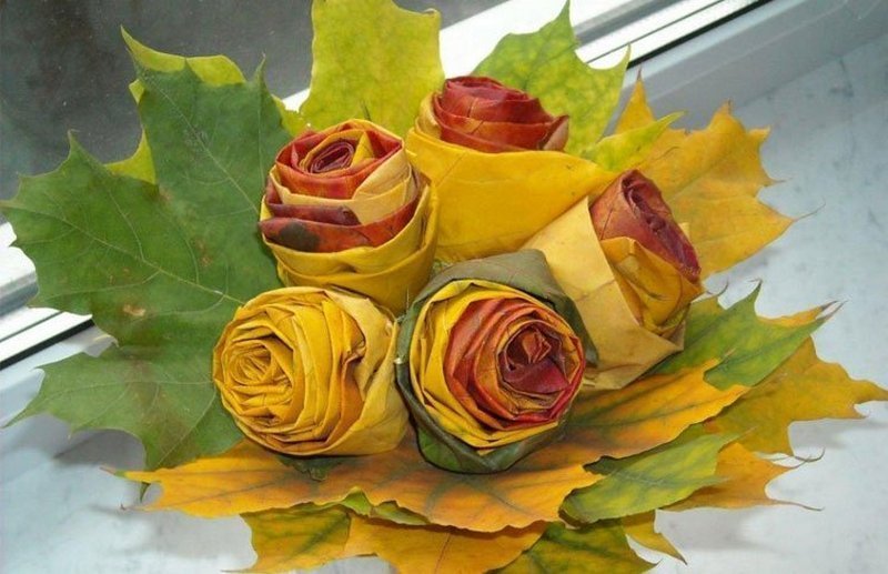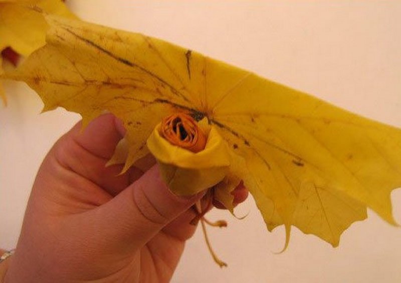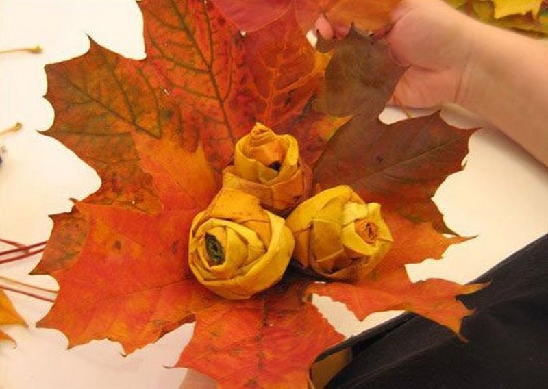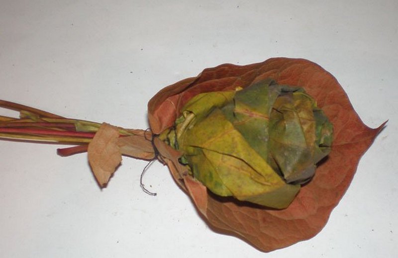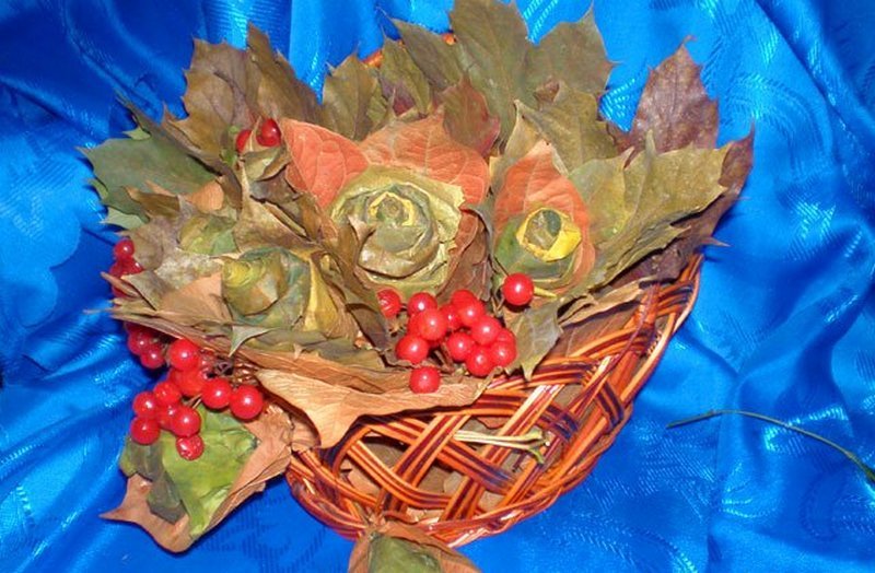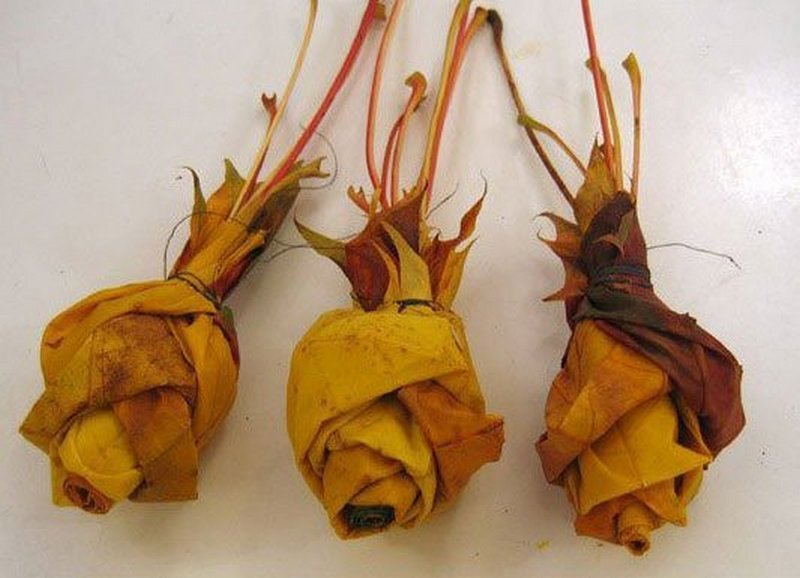 Para hacer un ramo, recolecta hojas de tamaño mediano. Son óptimos para crear rosas. Los brotes de dicho material serán densos y no se desmoronarán. Primero, la hoja se dobla por la mitad para que el lado "frontal" más liso permanezca afuera. Luego, comenzando por uno de los lados, se tuerce en un tubo apretado. El lugar del descanso debe estar en la parte superior. Ahora toman la segunda hoja, también doblada. Antes de enrollarlo en un tubo, se coloca la primera copia. Resulta una especie de muñeca de anidación "puff". Después de torcer el último folleto, la base del brote futuro se sujeta con un hilo. Entonces cada pétalo comienza a extenderse. Resulta una rosa ordenada. Después de hacer cinco o siete brotes, se pegan a ramas gruesas que reemplazarán los tallos. La composición se ata con una cinta de raso, decorada con conos plateados y racimos artificiales de cenizas de montaña, y luego se coloca en un florero de vidrio o cesta de mimbre.