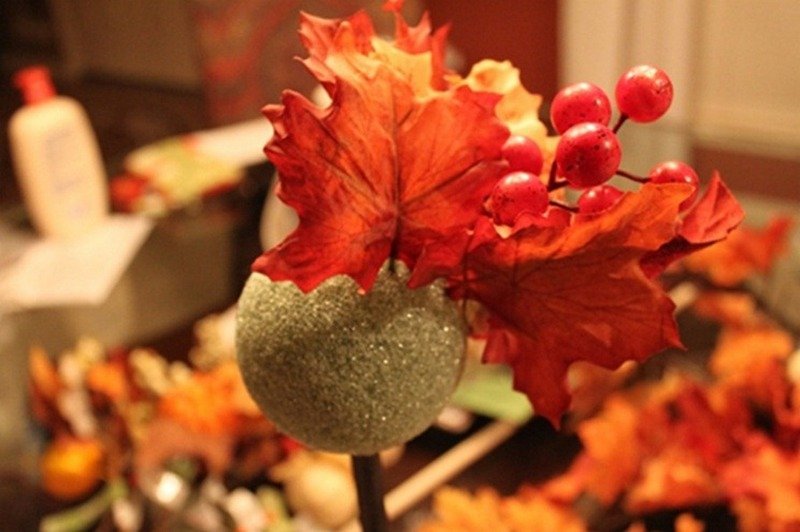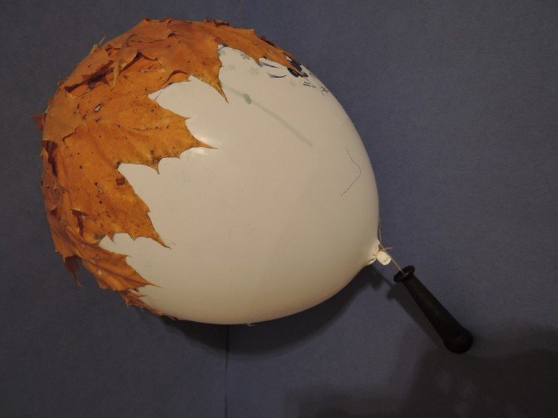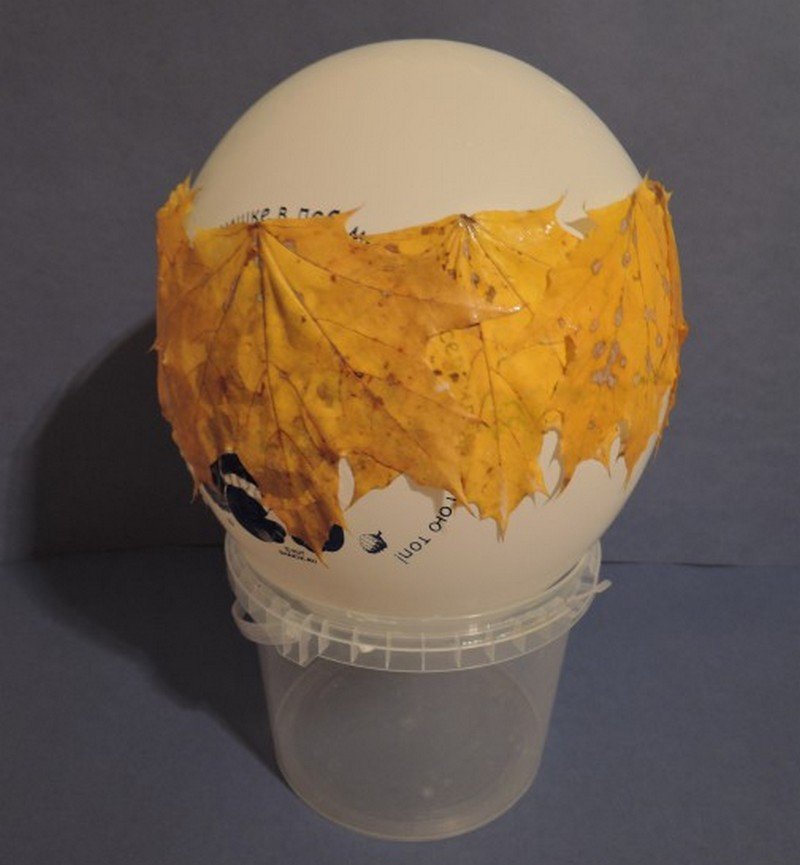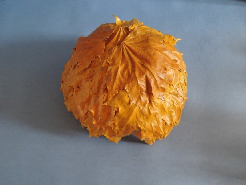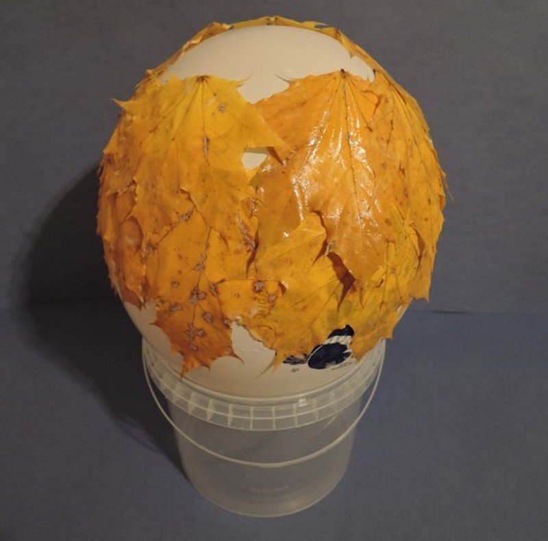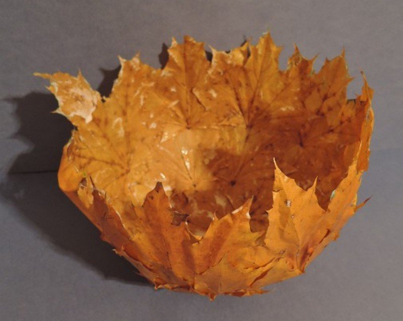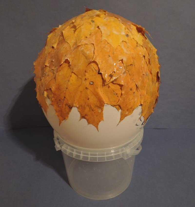 La decoración está lista, pero también se puede decorar con brillo en los "tonos carmesí" del otoño. Ahora solo queda esperar hasta que se seque por completo. Después de eso, el florero de las hojas se separa cuidadosamente de la base y la película se desconecta.El contenedor está listo para usar.