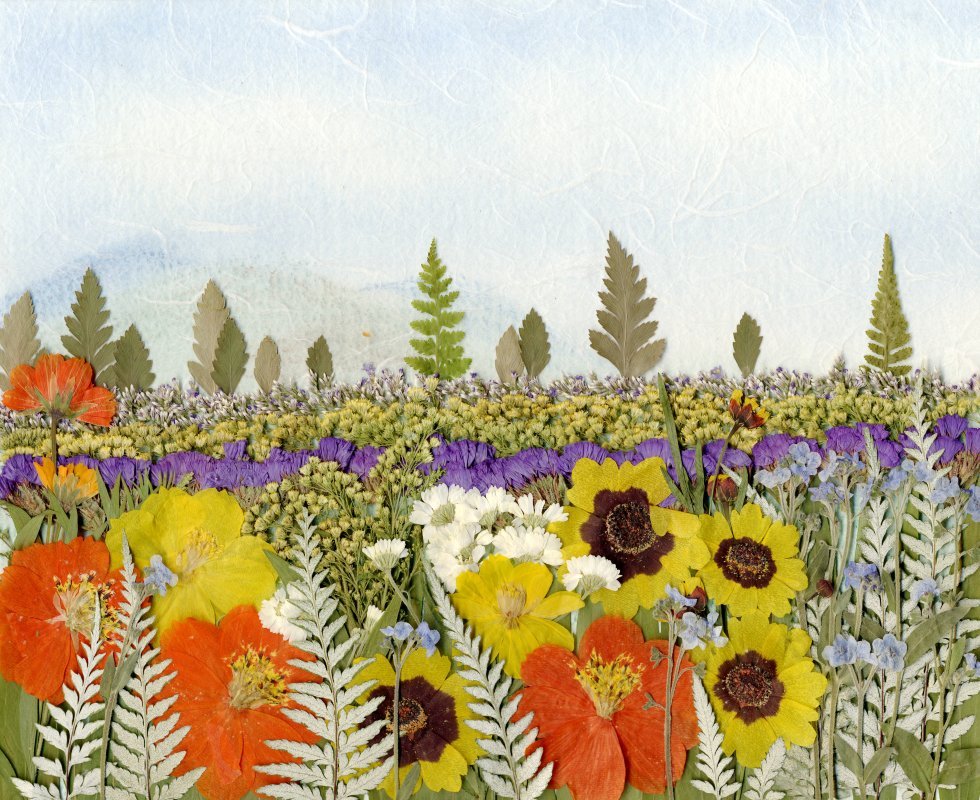 Flores secas, racimos de fresno de montaña, arpillera, conos, rudraksha (frutos secos de nogal indio con una superficie texturizada).