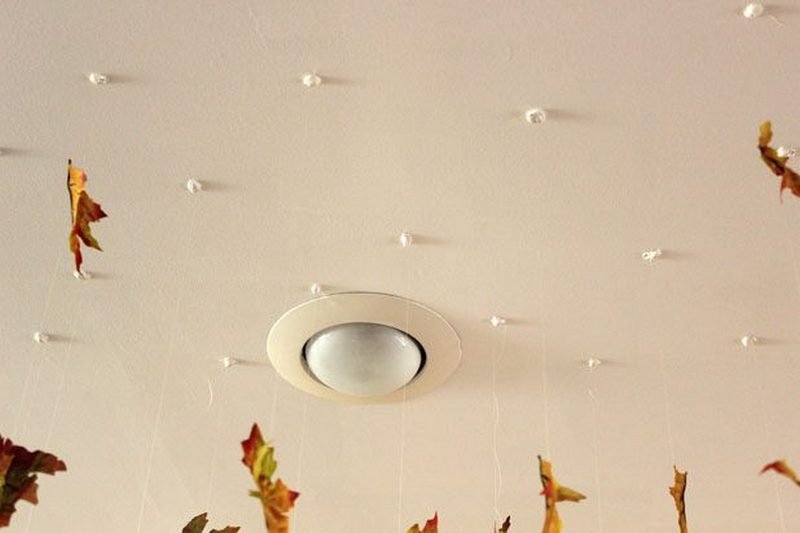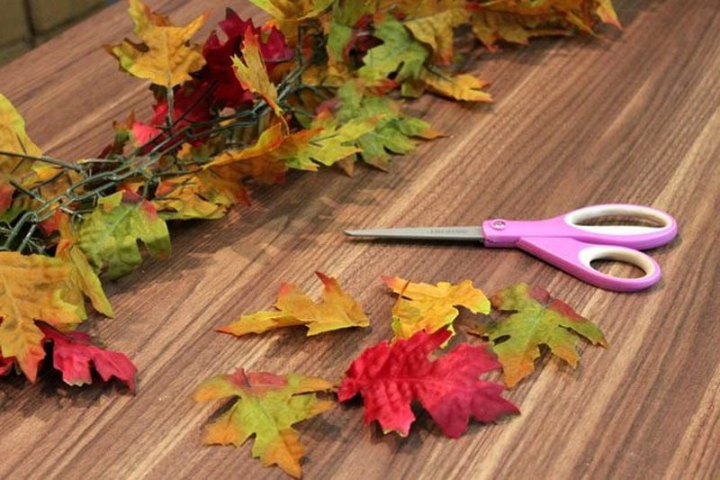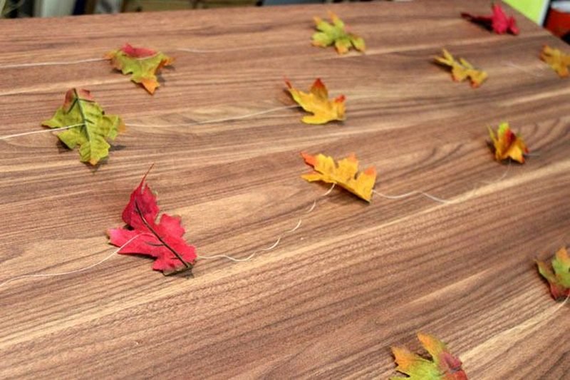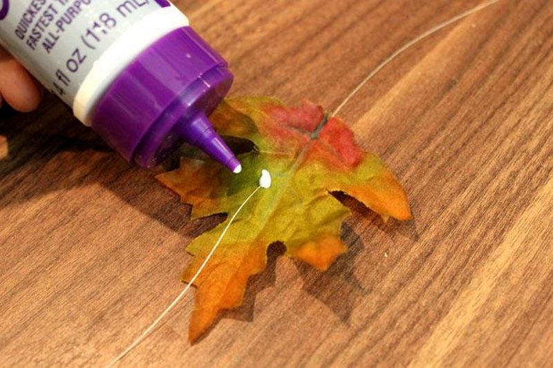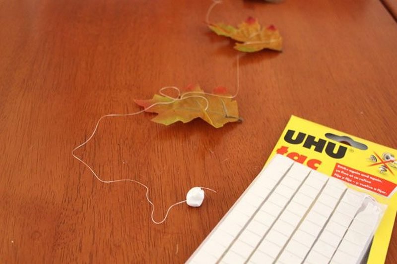 Primero, la línea de pesca se fija con cinta adhesiva sobre papel. Esto es necesario para que los componentes se puedan distribuir en una guirnalda con la misma sangría y al mismo tiempo no dañarlos. Luego se cortan esquejes de las hojas. Se aplican a la línea de pesca en una fila. Cada hoja está pegada. Después de que la composición se endurezca, retire la cinta de enmascarar, desconecte la línea del papel y la guirnalda estará lista.